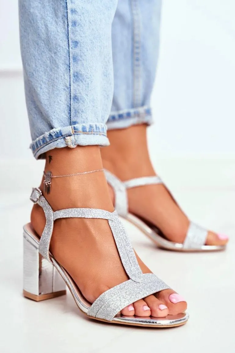 Sandały Damskie Na Słupku Brokatowe Srebrne Perfecto