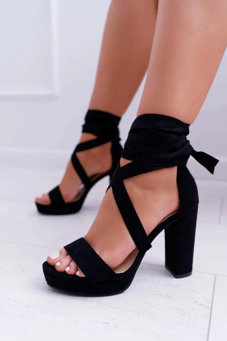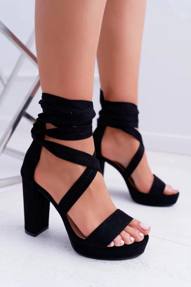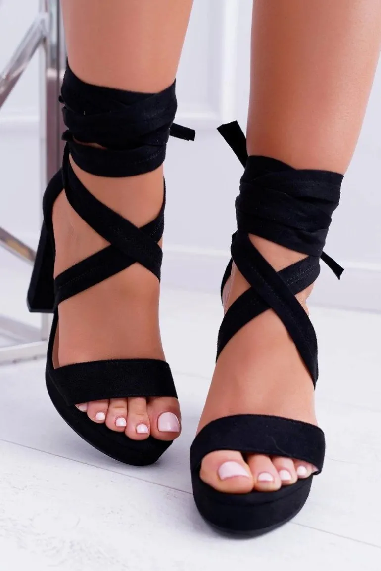 Sandały Damskie Na Słupku Platforma Wiązane Czarne LaFiesta