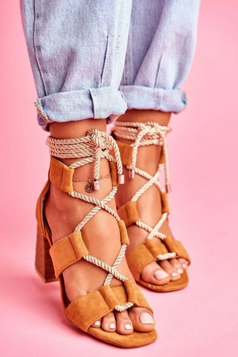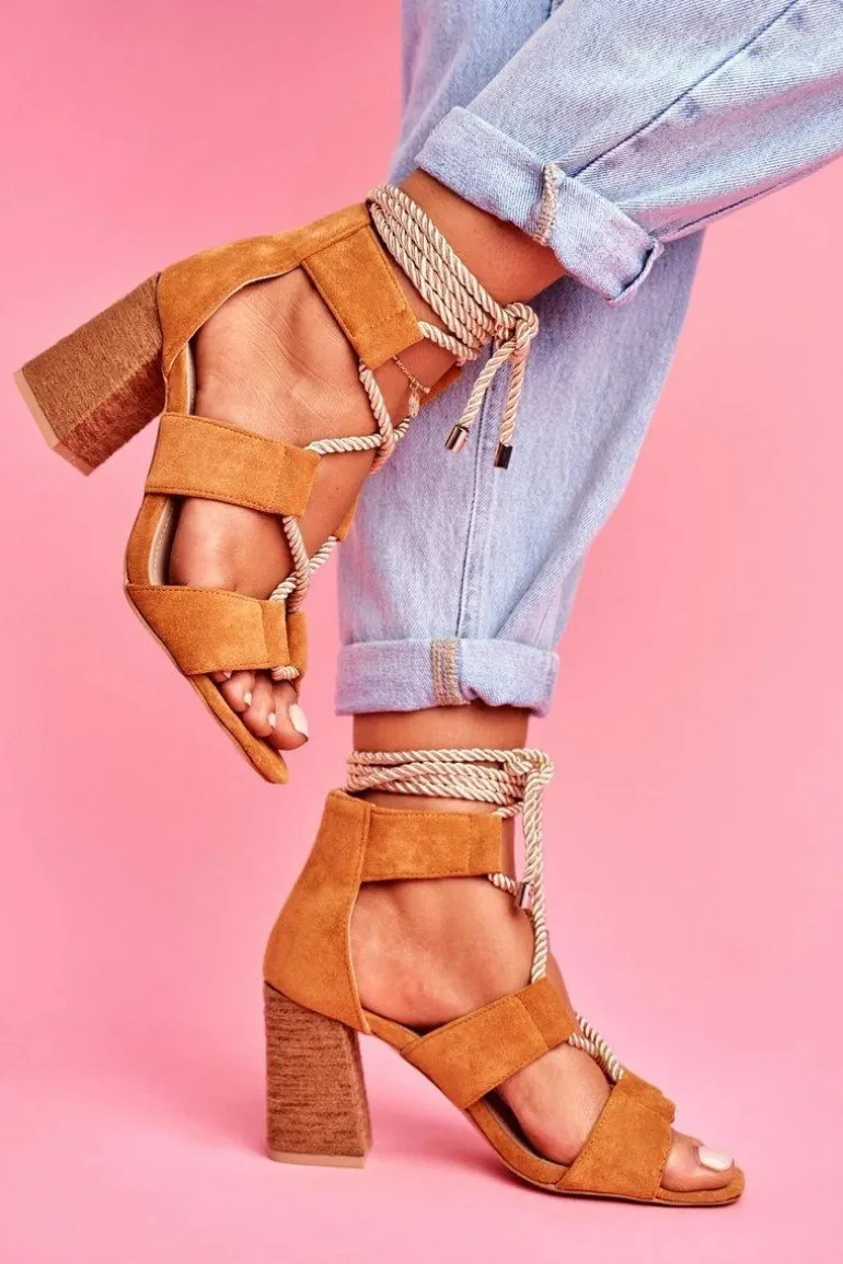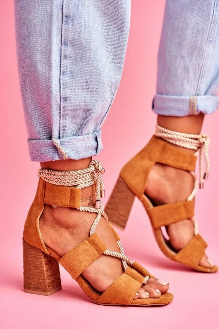 Sandały Damskie Na Słupku Wiązane Zamszowe Camel Amore