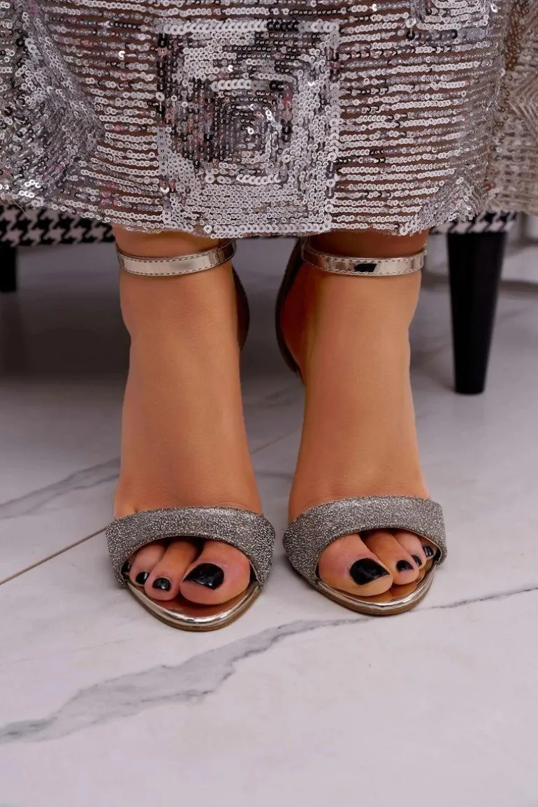 Wygodne sandały to marzenie każdej kobiety! Wysoki obcas i dobrze wyprofilowana wkładka zapewni Ci gwarancje dobrego samopoczucia oraz gustownego wyglądu. Piękne brokatowe kolory oraz materiał z którego zostały wykonane z pewnością sprawi, że zostaniesz zauważona! Sandałki zapinane na pasek wokół kostki. Przy wyborze rozmiaru prosimy sugerować się tabelą rozmiarów.