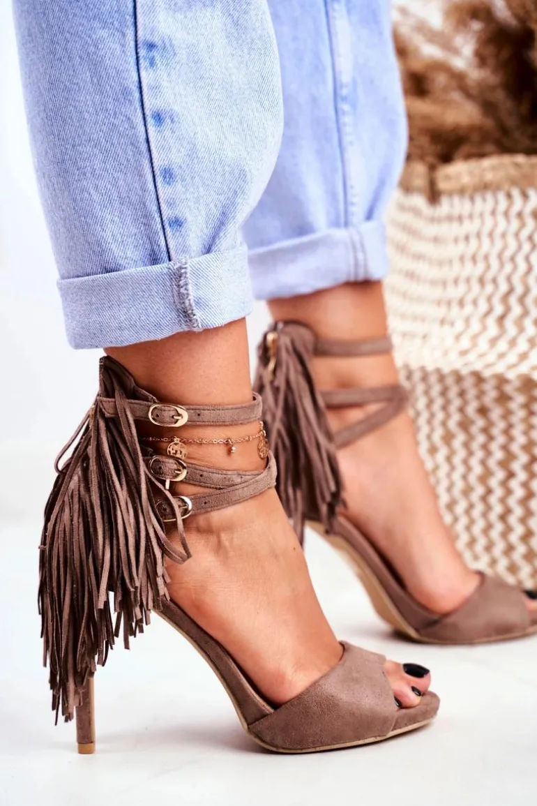Poczuj się seksownie z sandałkami niczym z brazylijskiego karnawału! Wysoka szpilka uniesie Twoją sylwetkę, podkreślając i eksponując to, co mamy najpiękniejsze. Potrójne, klasyczne zapięcie na paseczkach dobrze przytrzymają twoją stopę, a liczne frędzle dodają odrobinę szaleństwa do Twojej stylizacji! Przy wyborze rozmiaru prosimy sugerować się tabelą rozmiarów.