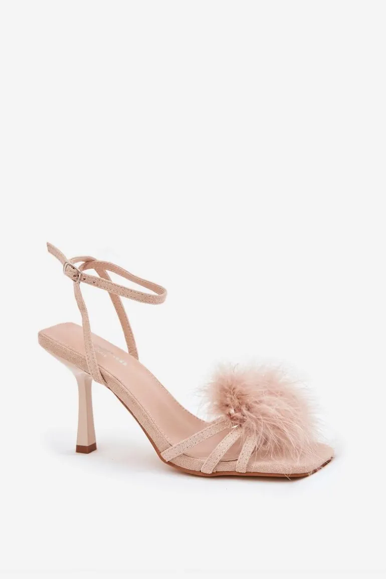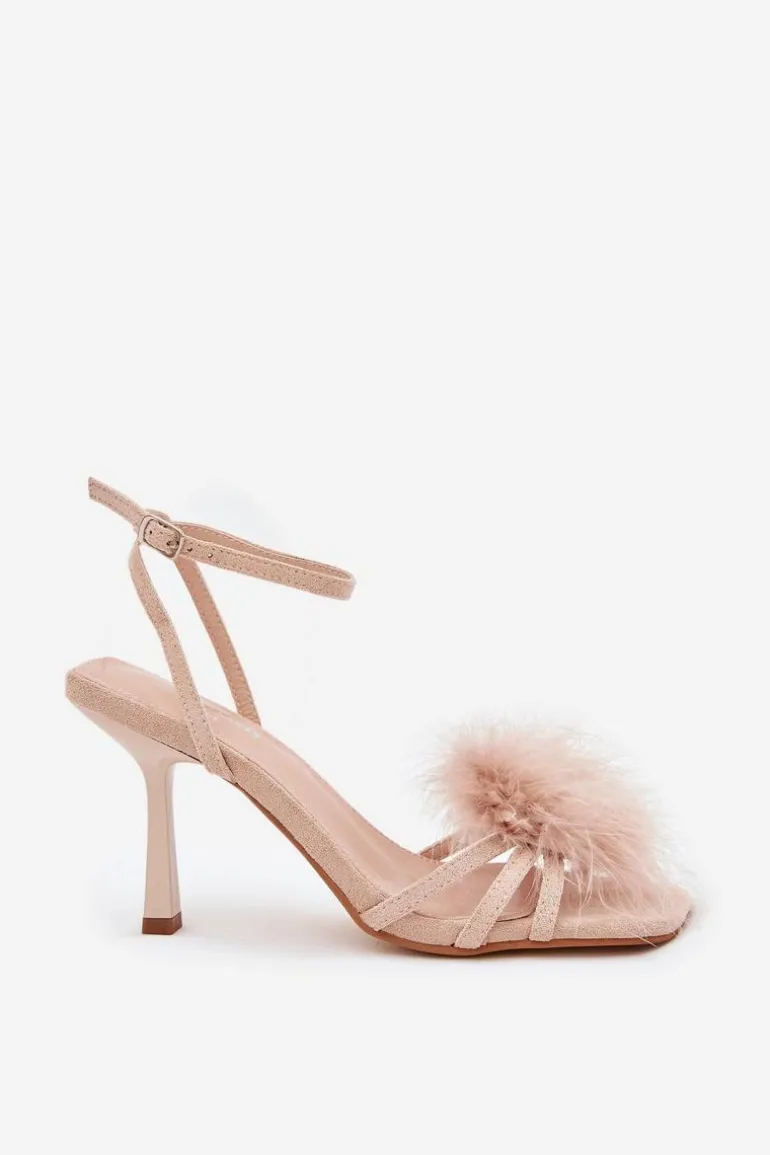 Eleganckie damskie sandały z eko zamszu, doskonałe na specjalne okazje. Osadzone na szykownej szpilce, wyróżniają się subtelną ozdobą z piór z przodu, co nadaje im lekkości i wyrafinowanego charakteru. Regulowany pasek ze sprzączką umożliwia idealne dopasowanie do stopy. To unikalny wybór, który doskonale dopełni wieczorowe i koktajlowe kreacje, przyciągając wzrok swoim niepowtarzalnym wyglądem. Przy wyborze rozmiaru prosimy sugerować się tabelą rozmiarów.
