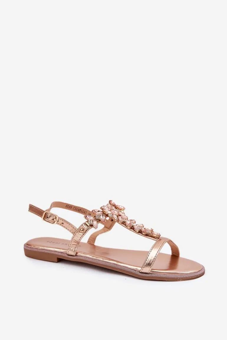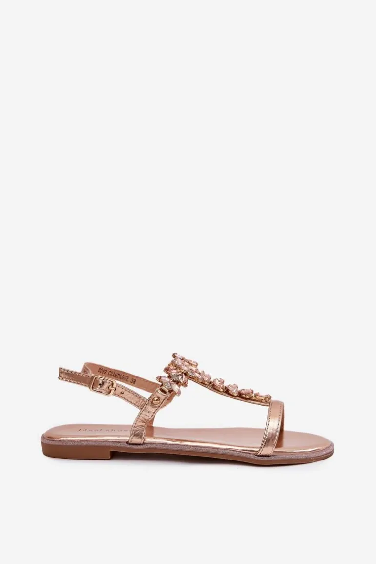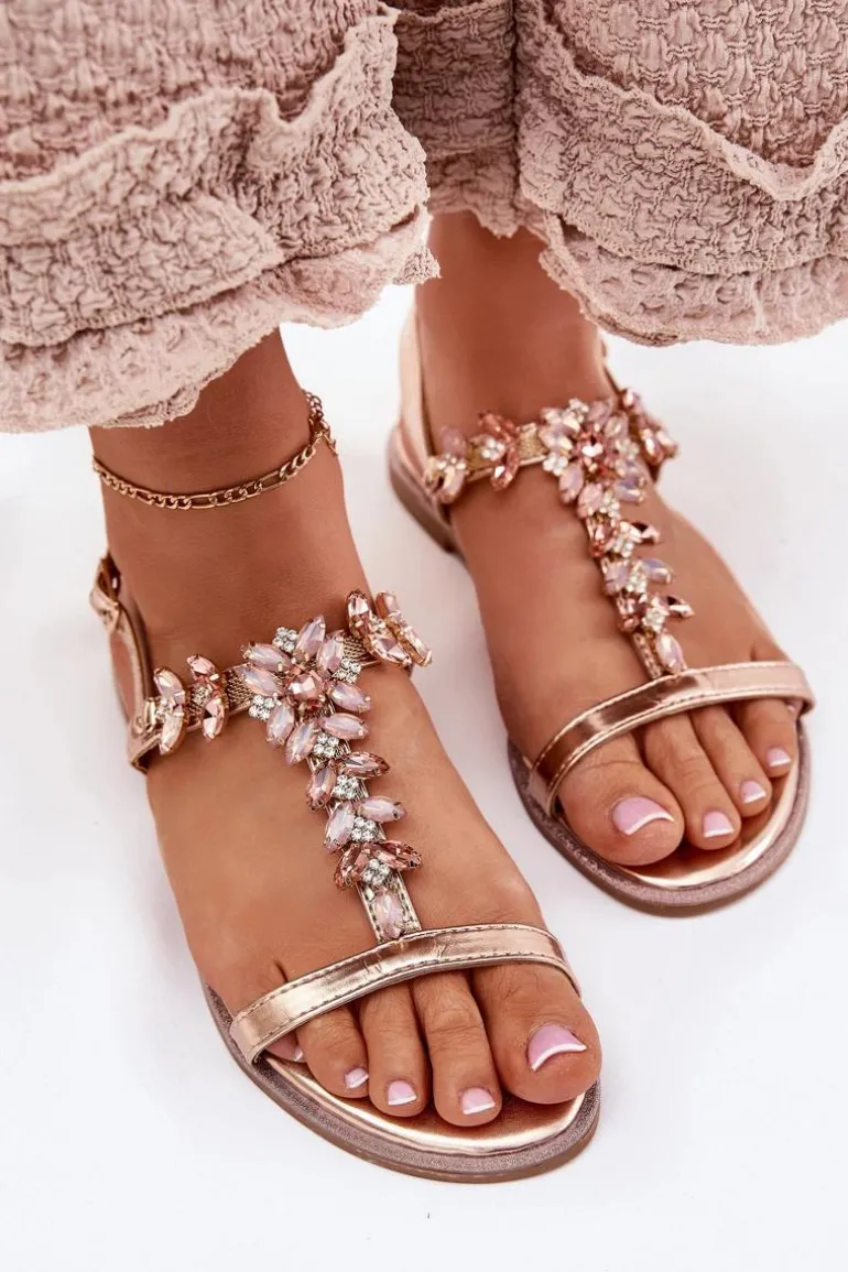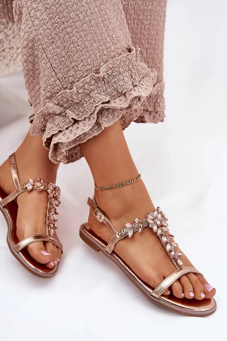 Sandały damskie z eko skóry na płaskim obcasie to doskonała propozycja na ciepłe dni. Zapinane na sprzączkę z regulowanym paskiem, zapewniają łatwe dopasowanie do stopy. Model wyróżnia się ozdobnymi kryształkami, a brokat przy podeszwie wprowadza odrobinę wyjątkowego uroku. Idealne do letnich stylizacji. Przy wyborze rozmiaru prosimy kierować się tabelą rozmiarów.