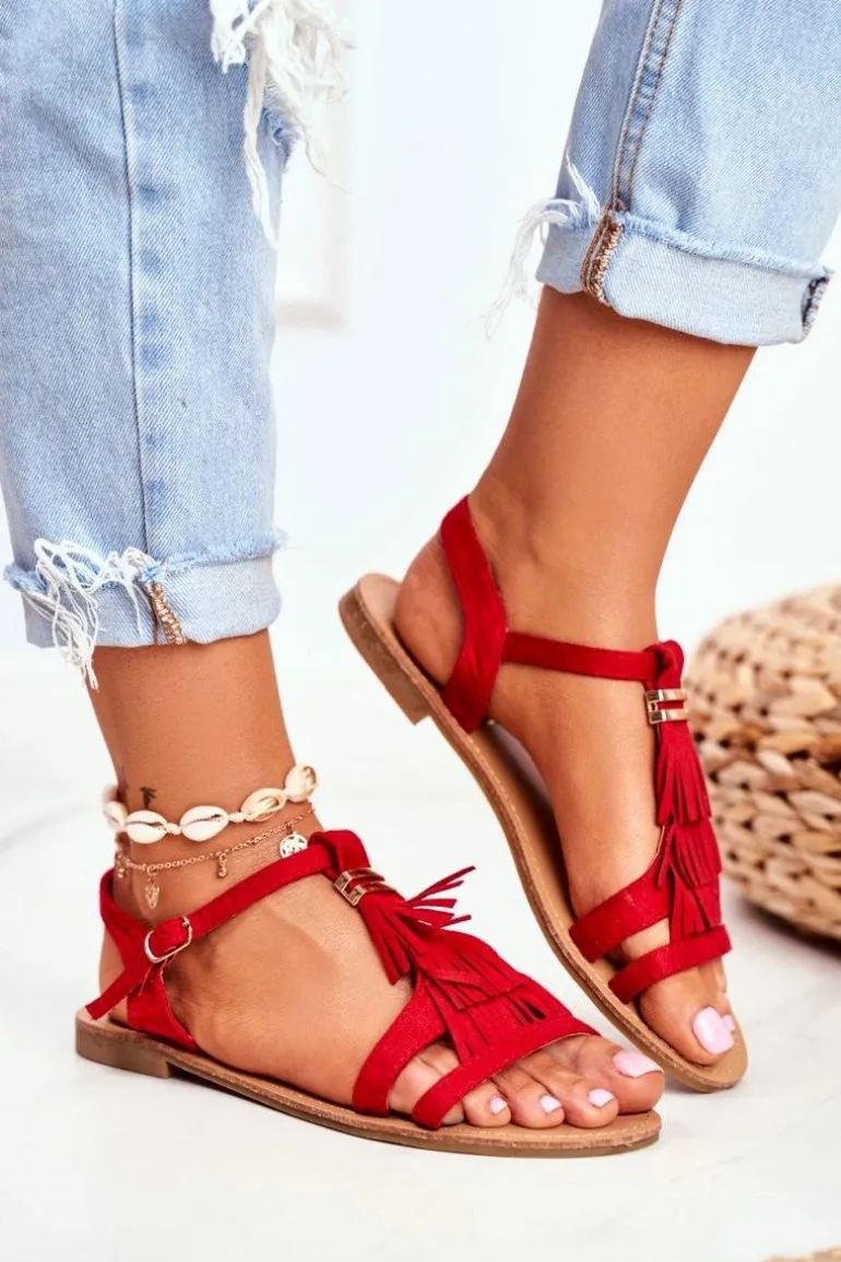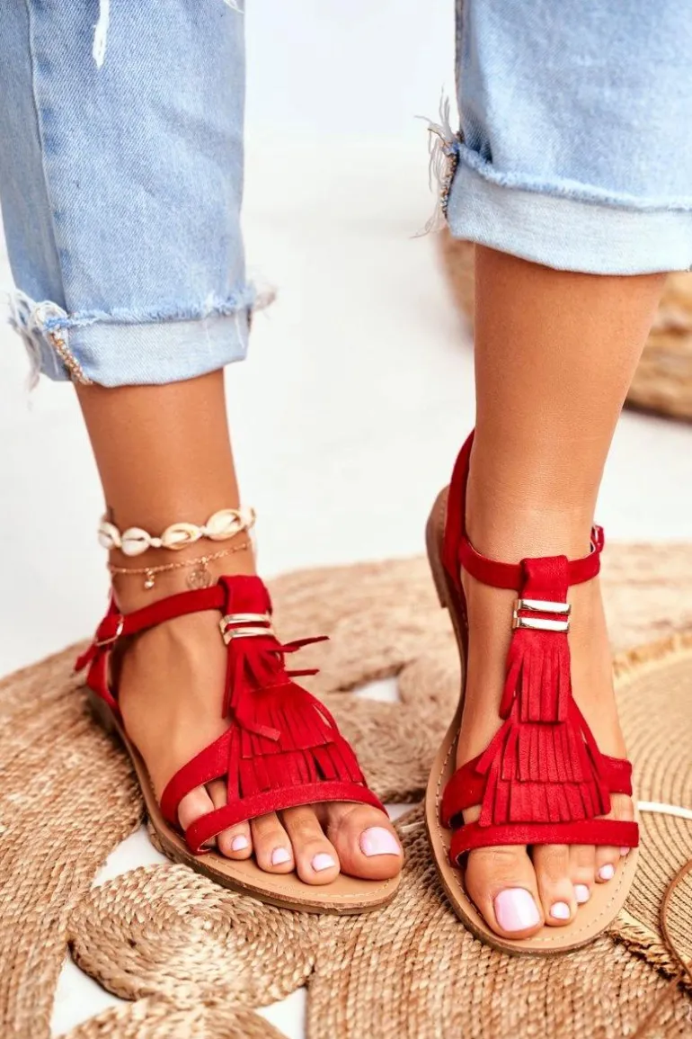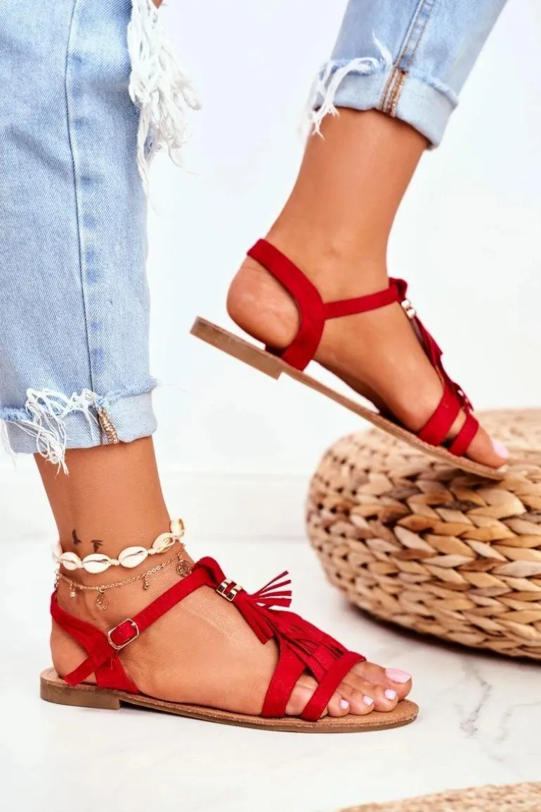 Sandały Damskie Płaskie Zamszowe Boho Czerwone Lucami
