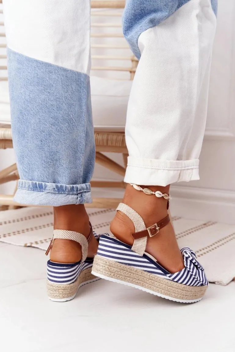 Piękne oraz wygodne sandały na koturnie wykonane z połączenia eko skóry, oraz tkaniny. Buty posiadają miękką wkładkę ze skóry ekologicznej. Modny fason w marynarskim stylu urozmaici Twoją letnią garderobę! Koniecznie sprawdź całą naszą kolekcję damskich sandałów. Przy wyborze rozmiaru prosimy sugerować się tabelą rozmiarów.