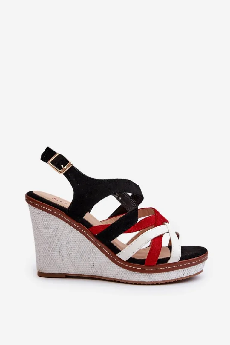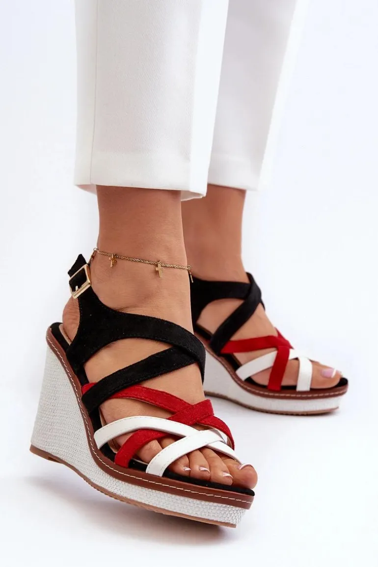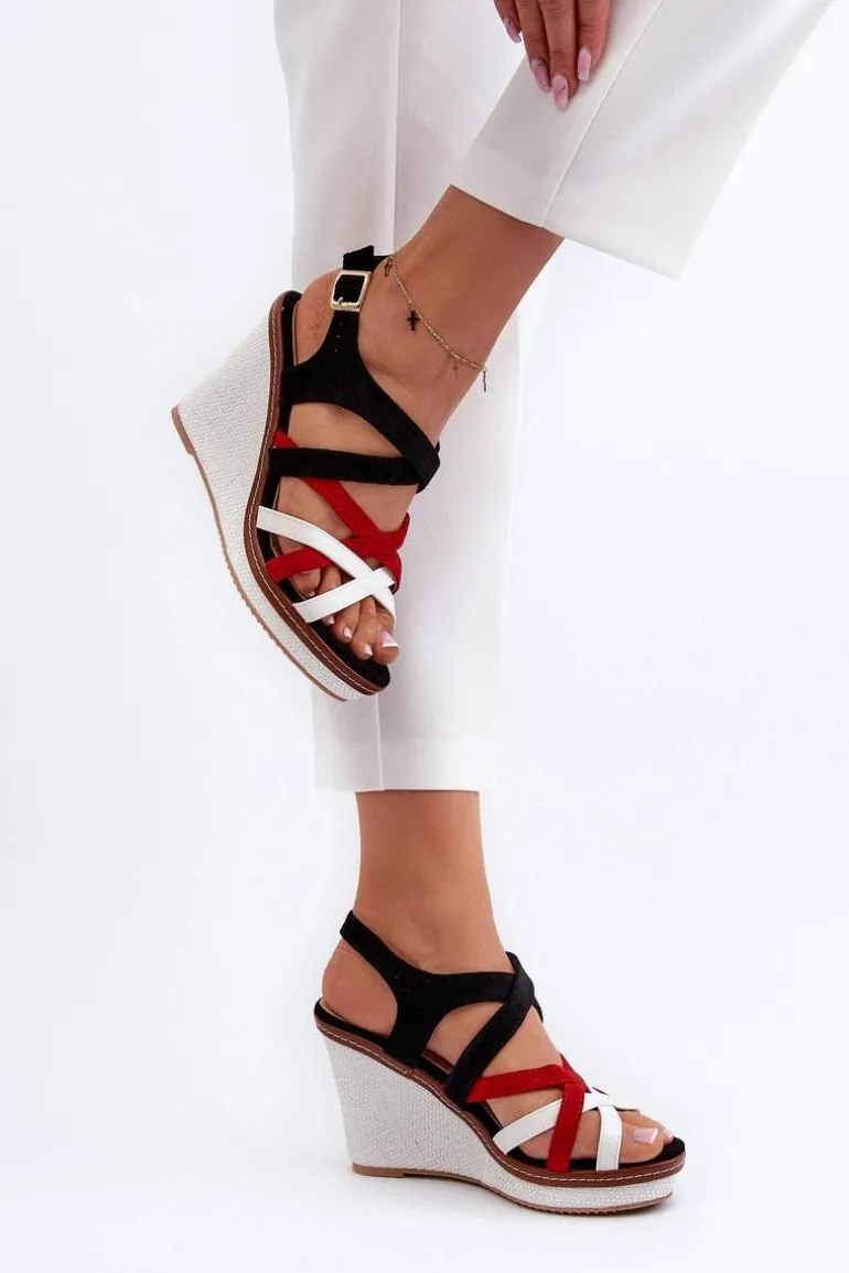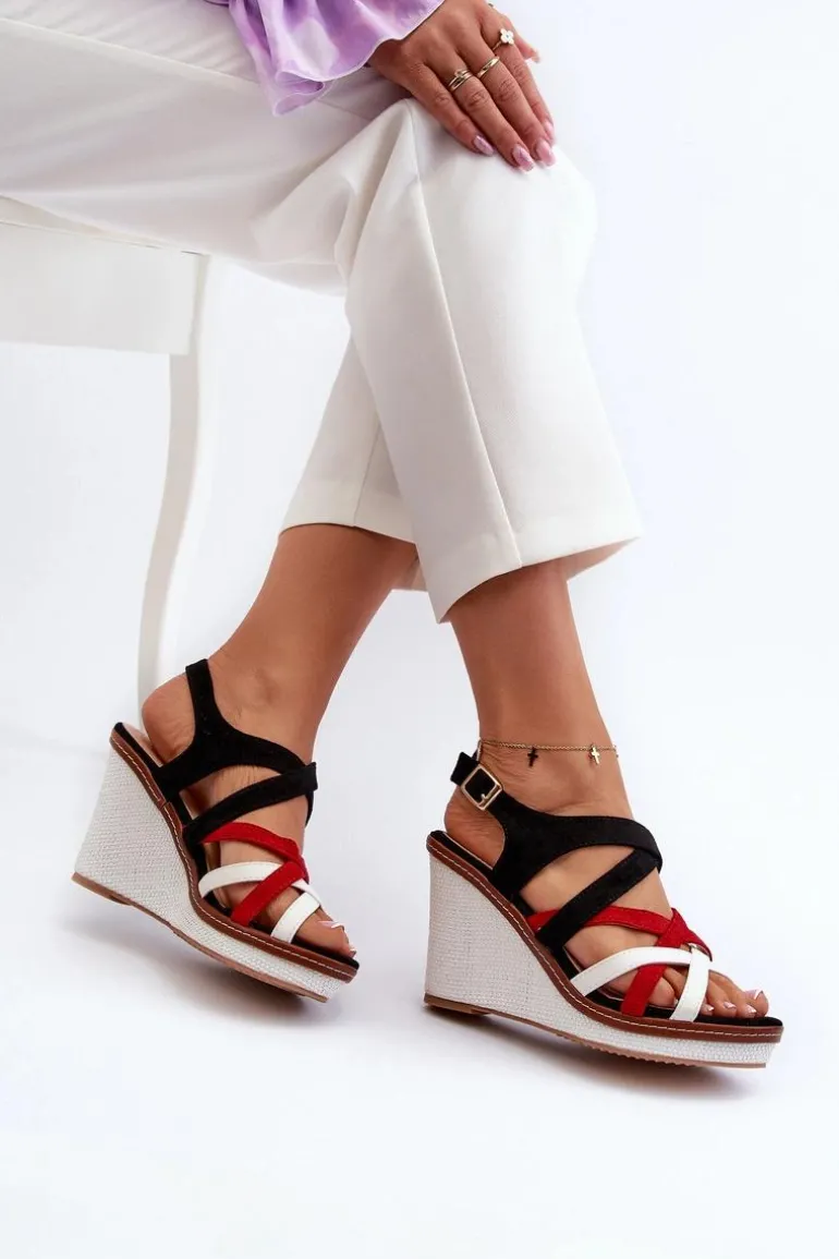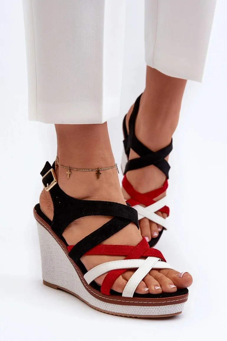 Wyjątkowe sandały damskie na platformie i koturnie. Cholewka została wykonana z eko skóry. Paseczki przeplatają się ze sobą tworząc wyjątkowy efekt. Buty posiadają miękką, eko skórzaną wkładkę. Sandałki są zapinane wokół kostki na sprzączkę z regulowanym paskiem. Podeszwa wykonana z tworzywa sztucznego jest antypoślizgowa, natomiast koturn wraz z platformą zostały ozdobione plecionką. Przy wyborze rozmiaru prosimy sugerować się tabelą rozmiarów.