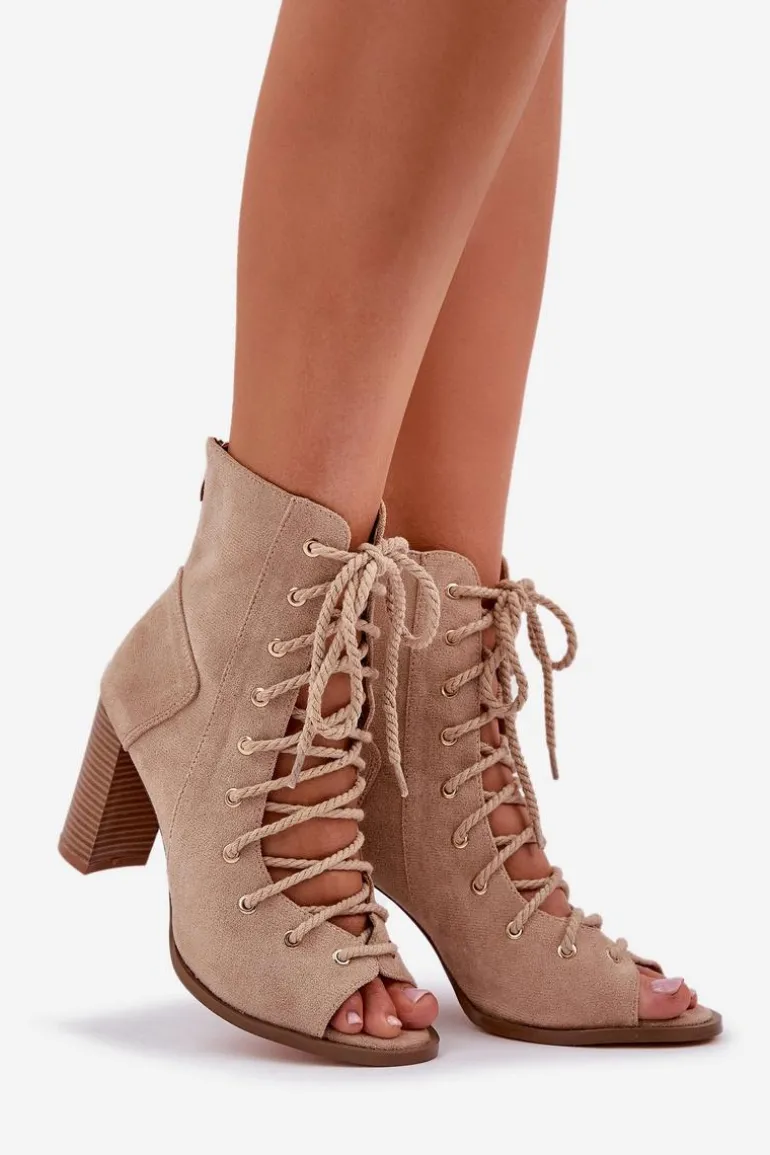 Sandały damskie z eko zamszu to elegancka propozycja na ciepłe dni. Osadzone na obcasie słupku, który zapewnia stabilność i wygodę. Sznurowana cholewka dodaje im nowoczesnego, a zarazem kobiecego charakteru, natomiast z tyłu znajdujące się zapięcie na zamek ułatwia ich zakładanie i zdejmowanie. Te sandały świetnie komponują się w letnich stylizacjach, łącząc styl, komfort i funkcjonalność. Przy wyborze rozmiaru prosimy sugerować się tabelą rozmiarów.
