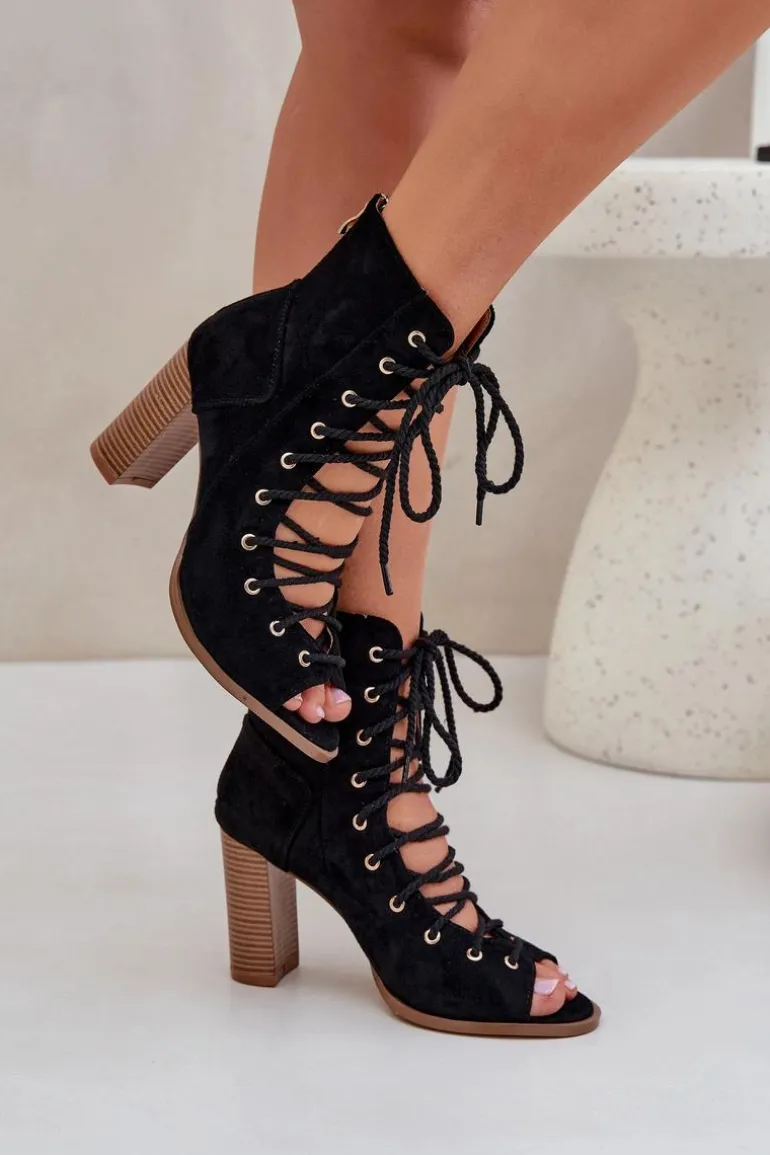 Sandały damskie z eko zamszu to elegancka propozycja na ciepłe dni. Osadzone na obcasie słupku, który zapewnia stabilność i wygodę. Sznurowana cholewka dodaje im nowoczesnego, a zarazem kobiecego charakteru, natomiast z tyłu znajdujące się zapięcie na zamek ułatwia ich zakładanie i zdejmowanie. Te sandały świetnie komponują się w letnich stylizacjach, łącząc styl, komfort i funkcjonalność. Przy wyborze rozmiaru prosimy sugerować się tabelą rozmiarów.