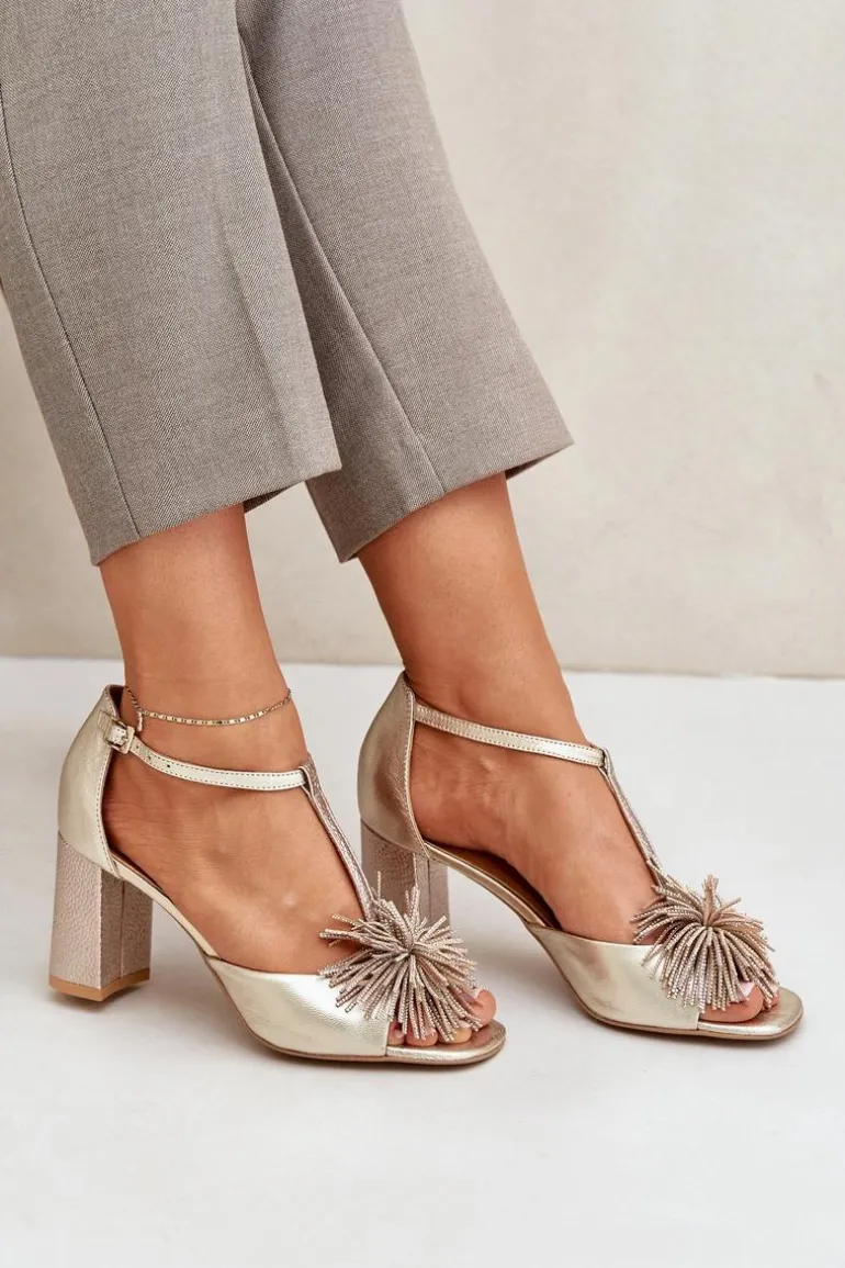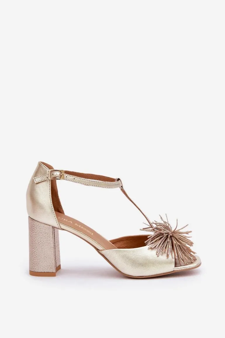 Sandały damskie wykonane ze skóry naturalnej. Osadzone na obcasie w postaci słupka. Zapinane na regulowany paseczek ze sprzączką. Model z zakrytą piętą. Z przodu ozdoba. Skórzana wkładka zapewni wygodę podczas użytkowania. Fason ten dopasujesz do eleganckich spodni, spódnic i sukienek. Przy wyborze rozmiaru prosimy sugerować się tabelą rozmiarów.