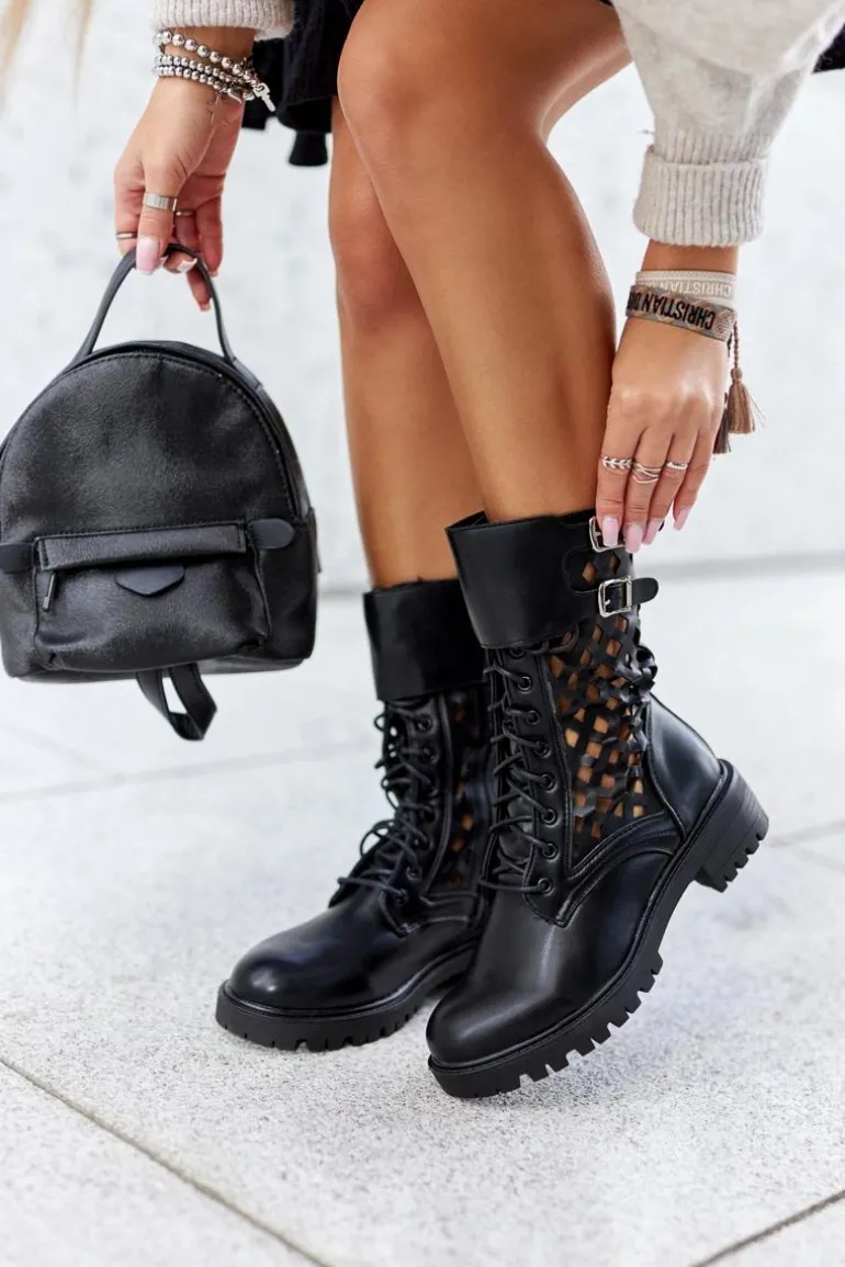 Botki, które wyrażą Twój charakter! Z nimi stworzysz wiele ciekawych stylizacji. Wysoka cholewka posiada ażurowe zdobienie oraz sprzączki. Klasyczny fason ze sznurowaniem oraz zapięciem na suwak. Botki w całości wykonane są z eko skóry. Nie czekaj! Musisz je mieć! Przy wyborze rozmiaru prosimy sugerować się tabelą rozmiarów.