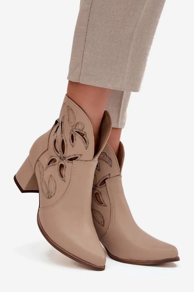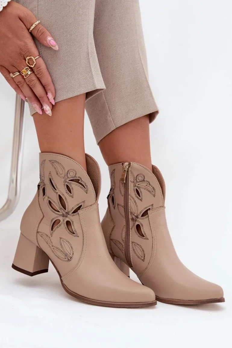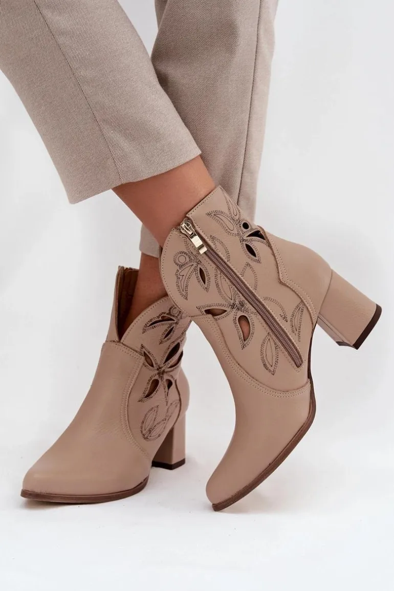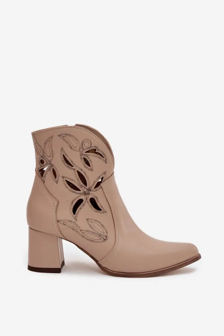 Botki damskie wykonane z naturalnej skóry. Ażurowy wzór dodaje im oryginalności i lekkości, podkreślając wyjątkowy charakter tego modelu. Obcas typu słupek zapewnia stabilność i wygodę, a jednocześnie pięknie wydłuża sylwetkę. Szpiczaste noski wprowadzają elegancki akcent, sprawiając, że buty prezentują się niezwykle zgrabnie. Dzięki zapięciu na zamek są łatwe w zakładaniu i zdejmowaniu, co zwiększa komfort codziennego użytkowania. To obuwie idealne na sezon przejściowy, które świetnie uzupełni zarówno casualowe, jak i bardziej eleganckie zestawy. Przy wyborze rozmiaru prosimy sugerować się tabelą rozmiarów.