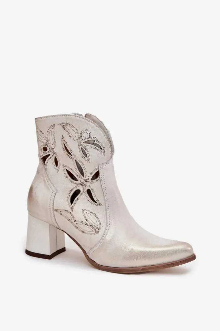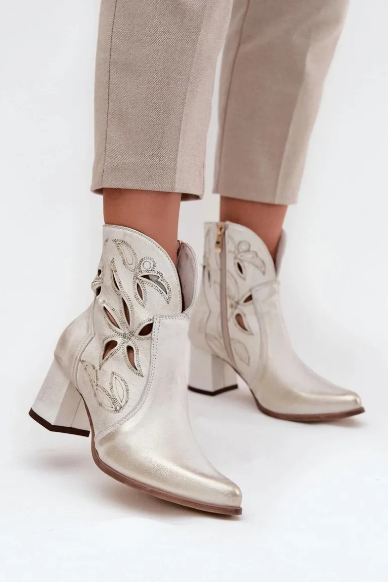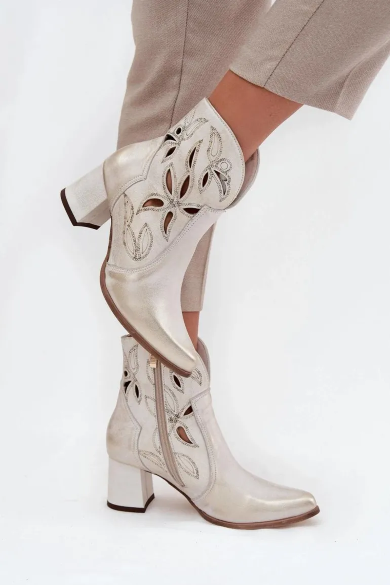 Skórzane Ażurowe Botki Damskie Na Słupku Zazoo 3647 Złoty Przecierany