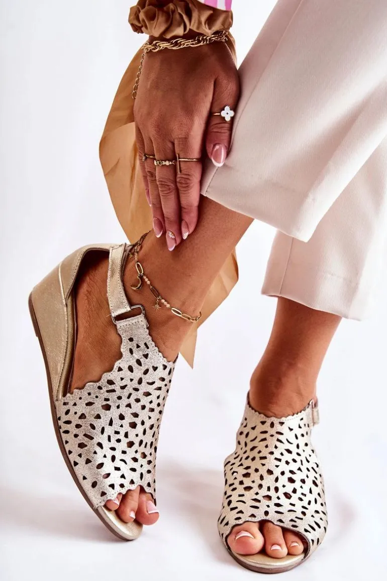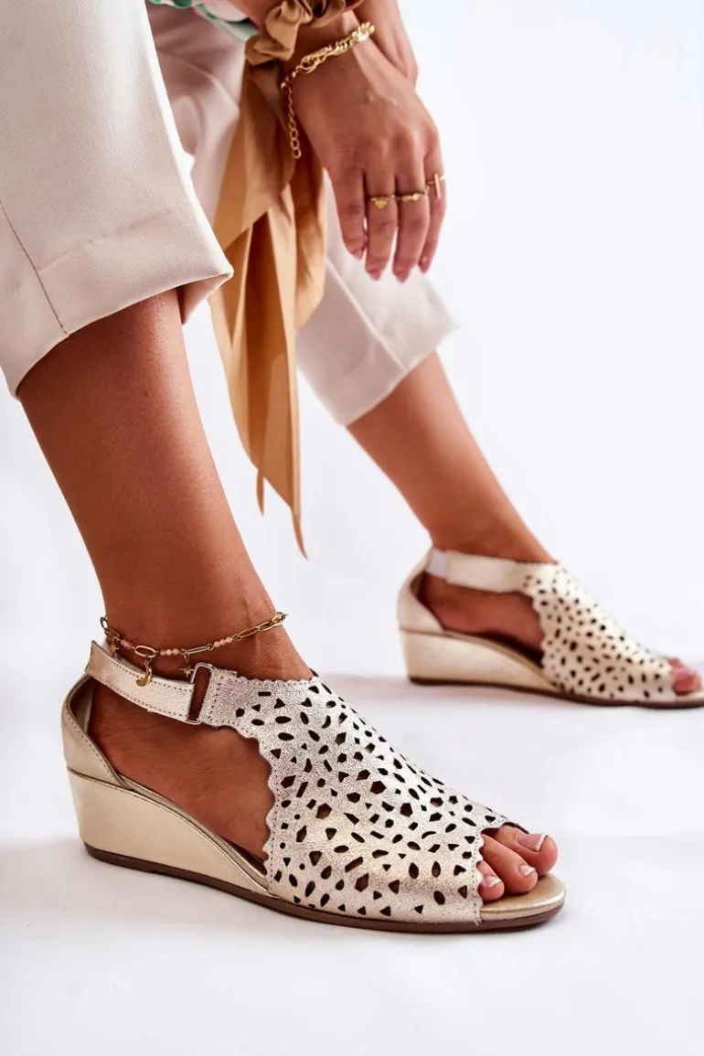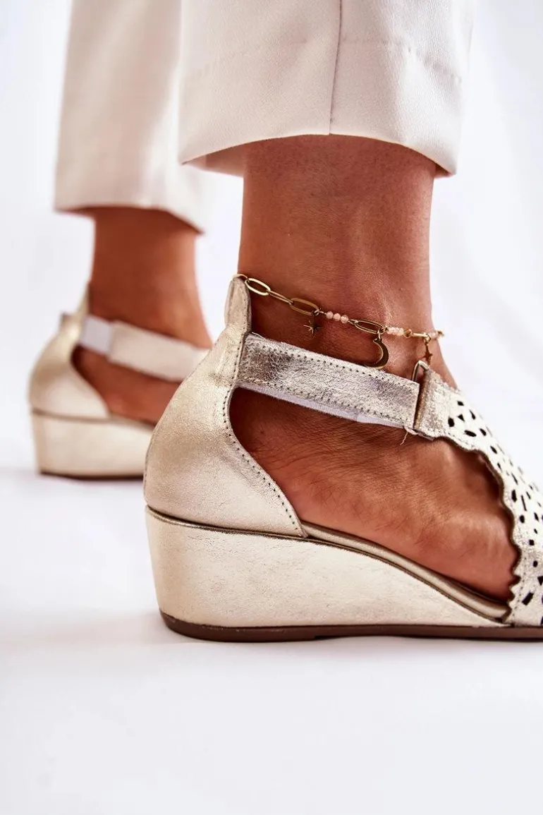 Sandały damskie wykonane z naturalnej skóry w ażurowy wzór. Zapinane przy kostce na rzep. Dodatkowo znajduje się także gumka przy usztywnianym zapiętku, co pozwoli na odpowiednie dopasowanie obuwia. Buty są osadzone na koturnie. Sandały posiadają odkryty, zaokrąglony nosek. Miękka wkładka wykonana także z naturalnej skóry pozwoli na wygodne użytkowanie obuwia. Fason idealny na upalne dni! Przy wyborze rozmiaru prosimy sugerować się tabelą rozmiarów.