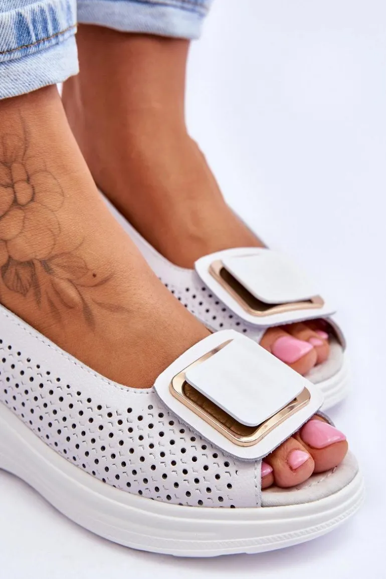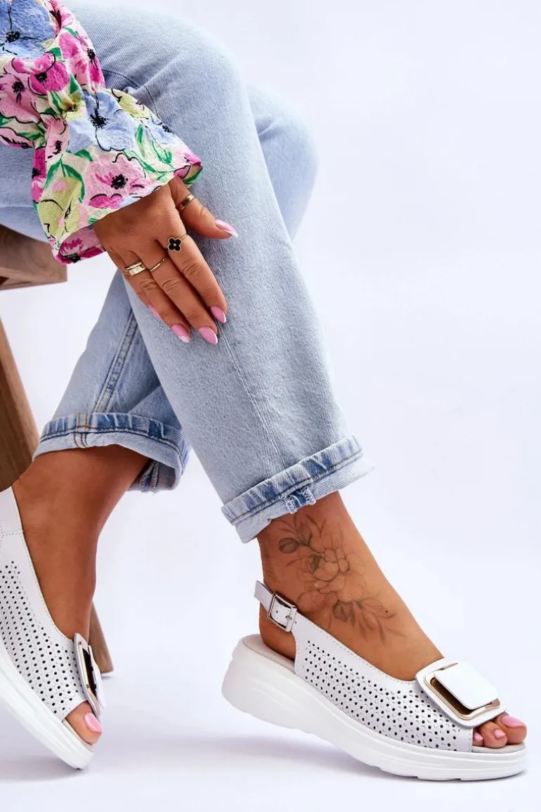 Niezwykle wygodne sandały damskie zostały wykonane z wysokiej jakości naturalnej skóry. Model ten posiada zapinanie na regulowany pasek ze sprzączką. Sandałki są przewiewne, dzięki ażurowemu wzorkowi. Miękka wkładka z naturalnej skóry zapewni komfortowe użytkowanie. Sandałki osadzono na koturnie i platformie. Na przodzie znajduje się ozdobny element z tworzywa. Przy wyborze rozmiaru prosimy sugerować się tabelą rozmiarów.