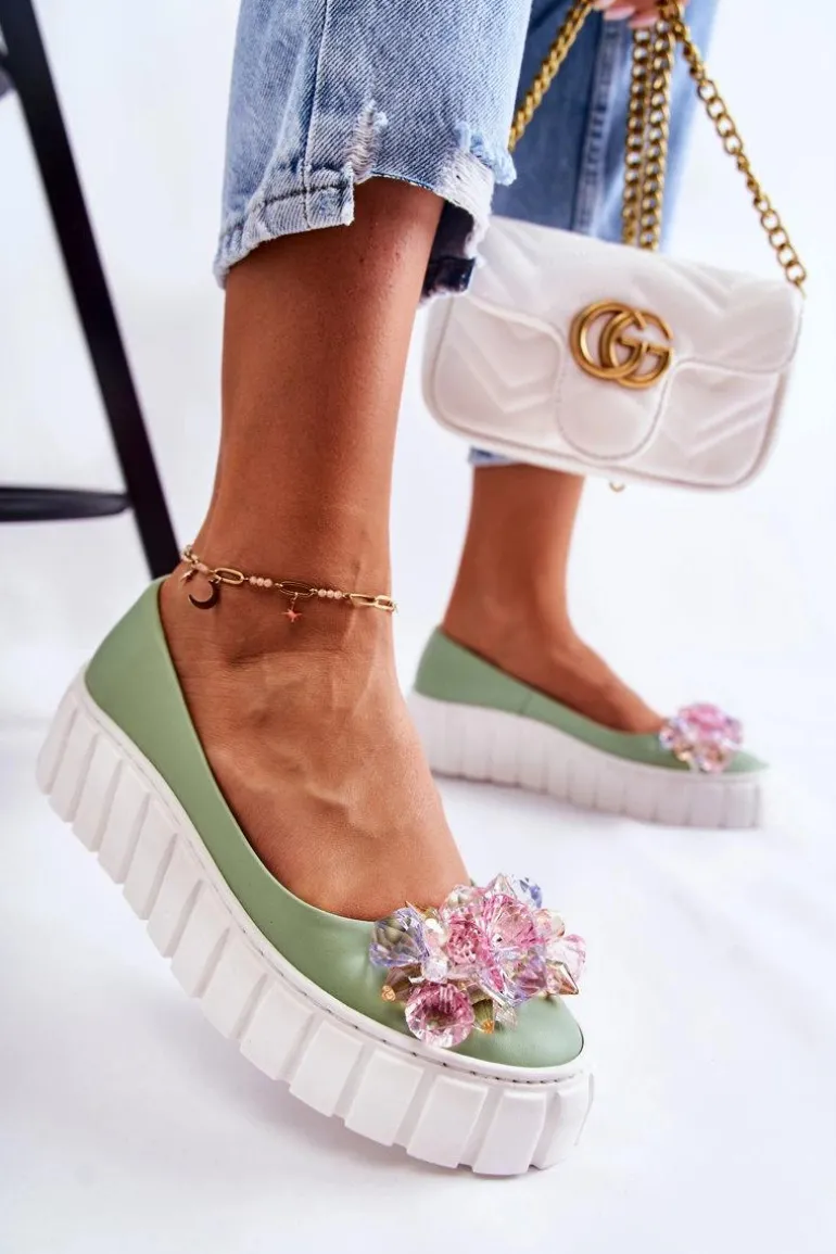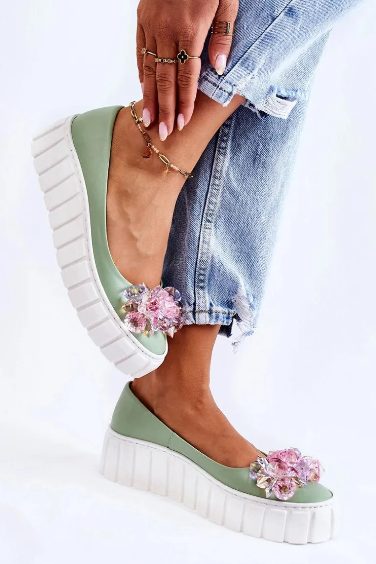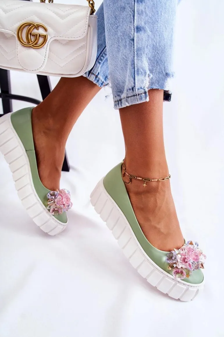 Damskie baleriny wykonane z naturalnej skóry z dbałością o każdy detal. O komfort zadba miękka, skórzana wkładka. Podeszwa wykonana z gumowego tworzywa ze żłobieniami po bokach. Dodatkowo jest antypoślizgowa. Zapiętek jest usztywniany. Z przodu elegancka ozdoba w postaci imitacji kryształków doda tym butom uroku. Nosek zaokrąglony. Baleriny dopełnią wiele Twoich stylizacji. Przy wyborze rozmiaru prosimy sugerować się tabelą rozmiarów.