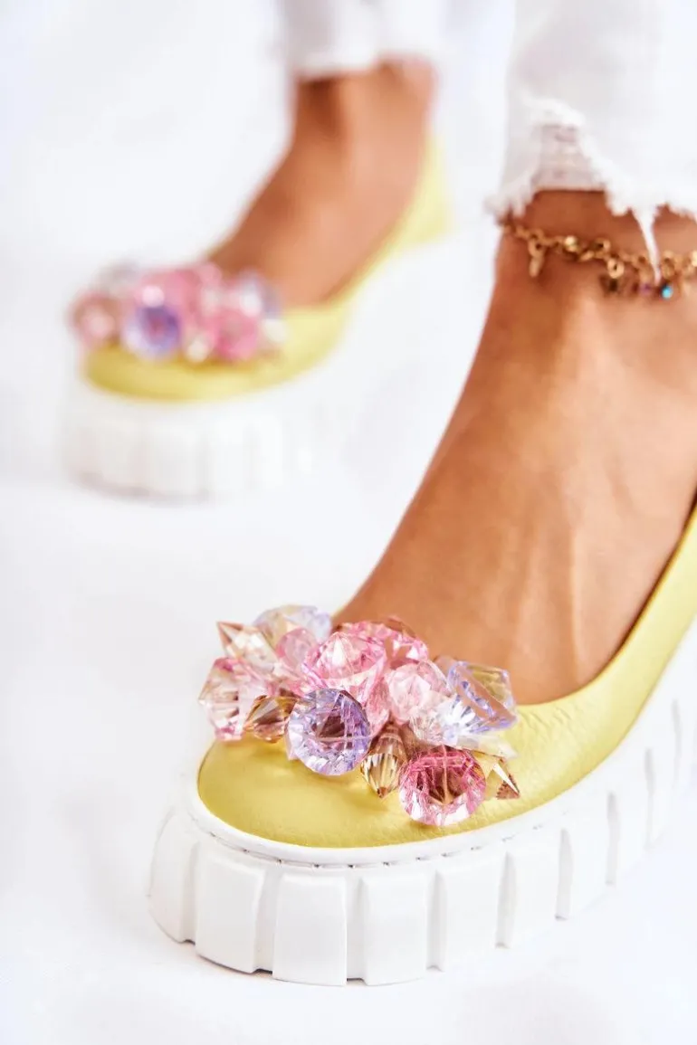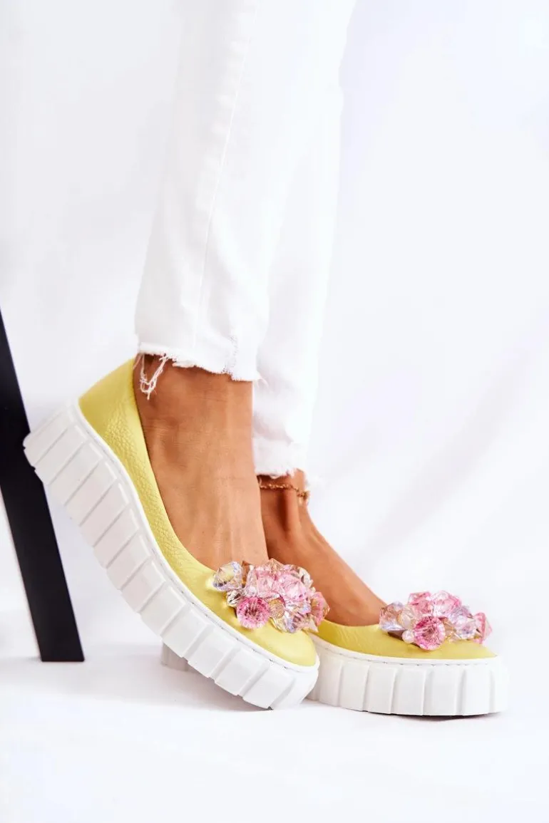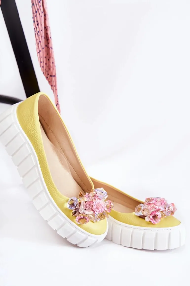 Damskie baleriny wykonane z naturalnej skóry z dbałością o każdy detal. O komfort zadba miękka, skórzana wkładka. Podeszwa wykonana z gumowego tworzywa ze żłobieniami po bokach. Dodatkowo jest antypoślizgowa. Zapiętek jest usztywniany. Z przodu elegancka ozdoba w postaci imitacji kryształków doda tym butom uroku. Nosek zaokrąglony. Baleriny dopełnią wiele Twoich stylizacji. Przy wyborze rozmiaru prosimy sugerować się tabelą rozmiarów.