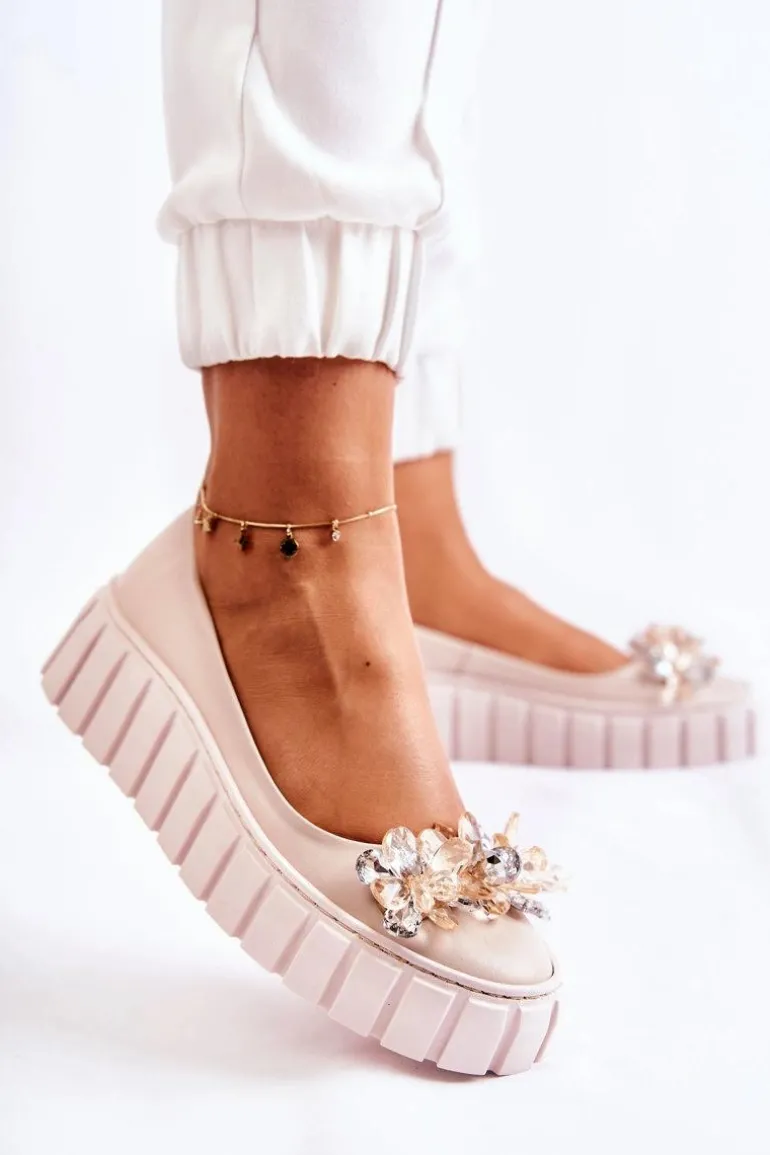 Damskie baleriny wykonane z naturalnej skóry z dbałością o każdy detal. O komfort zadba miękka, skórzana wkładka. Podeszwa wykonana z gumowego tworzywa ze żłobieniami po bokach. Dodatkowo jest antypoślizgowa. Zapiętek jest usztywniany. Z przodu elegancka ozdoba w postaci imitacji kryształków doda tym butom uroku. Nosek zaokrąglony. Baleriny dopełnią wiele Twoich stylizacji. Przy wyborze rozmiaru prosimy sugerować się tabelą rozmiarów.
