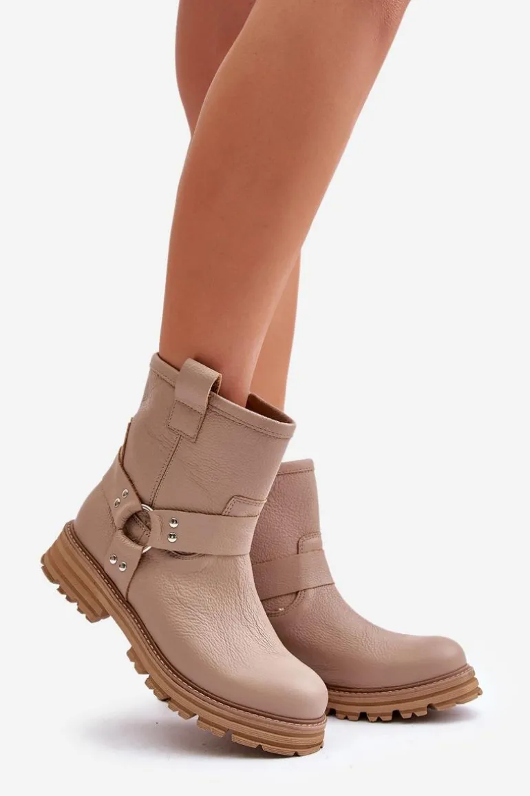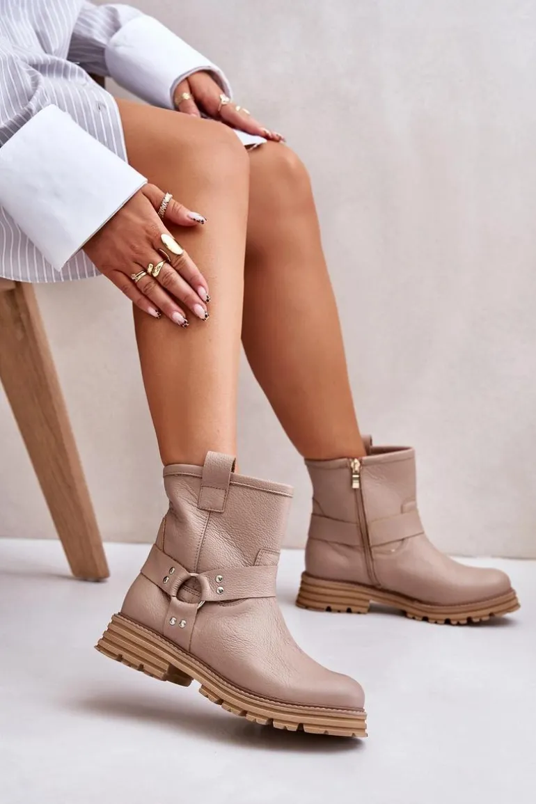 Skórzane Botki Damskie Na Płaskim Obcasie Lewski 3610 Beżowe