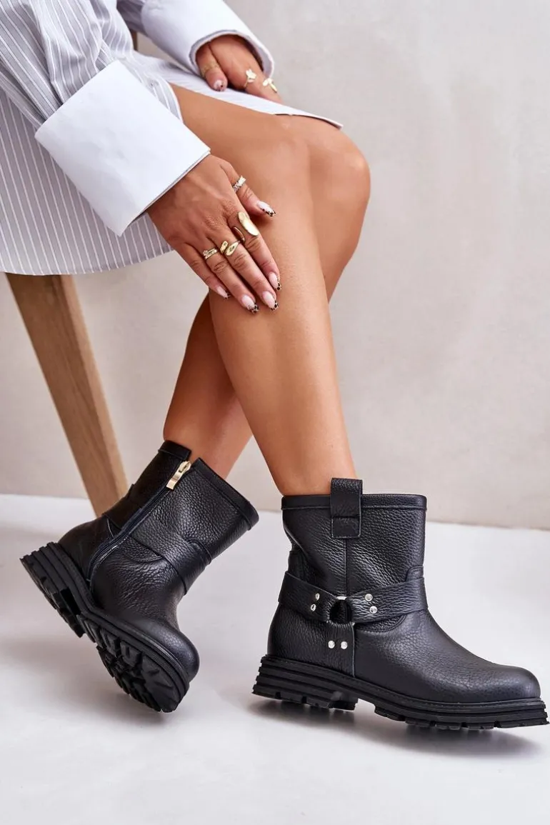 Botki wykonane z naturalnej skóry to idealny wybór na każdą okazję. Osadzone na płaskim obcasie, zapewniają komfort i stabilność podczas chodzenia. Zaokrąglone noski dodają subtelnego charakteru. Model zapinany na zamek, co ułatwia zakładanie. Cholewka ozdobiona efektownym połączeniem pasków, które dodają stylowego akcentu. Te botki świetnie sprawdzą się w codziennych stylizacjach, łącząc elegancję z wygodą. Przy wyborze rozmiaru prosimy sugerować się tabelą rozmiarów.