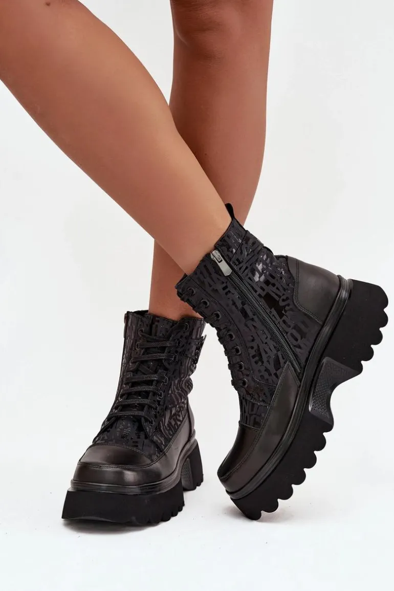 Botki damskie marki Artiker to stylowe obuwie stworzone z myślą o chłodniejszych dniach. Wykonane z naturalnej skóry, wyróżniają się solidnością i modnym wyglądem. Osadzone na stabilnej platformie, zapewniają komfort noszenia i nowoczesny wygląd. Model posiada zarówno sznurowanie, jak i praktyczny zamek, co ułatwia zakładanie oraz dopasowanie do stopy. Cholewkę zdobią modne napisy oraz pasek z ozdobnym detalem. Wnętrze ocieplone sprawia, że świetnie sprawdzą się w sezonie jesienno-zimowym. Przy wyborze rozmiaru prosimy sugerować się tabelą rozmiarów.