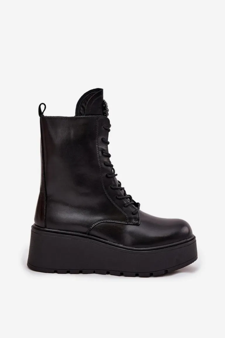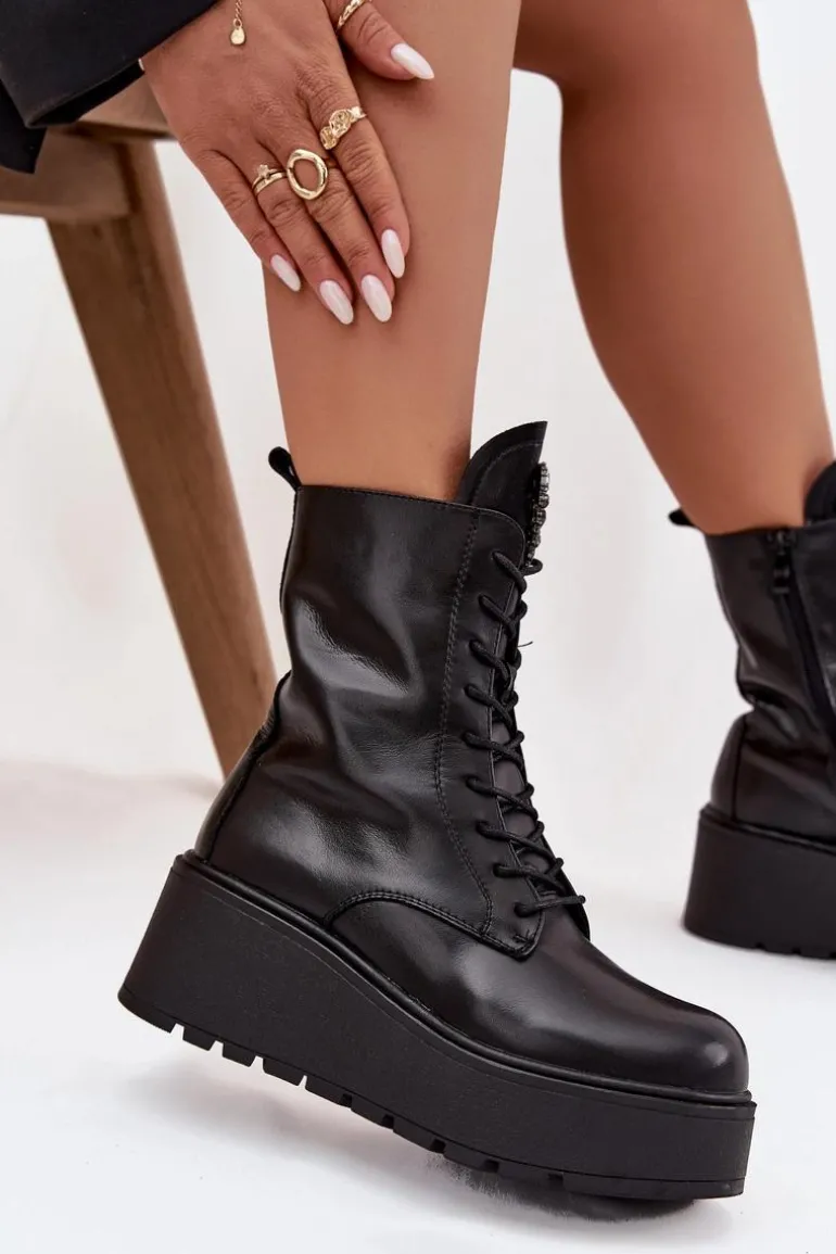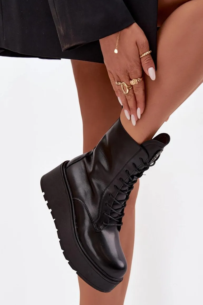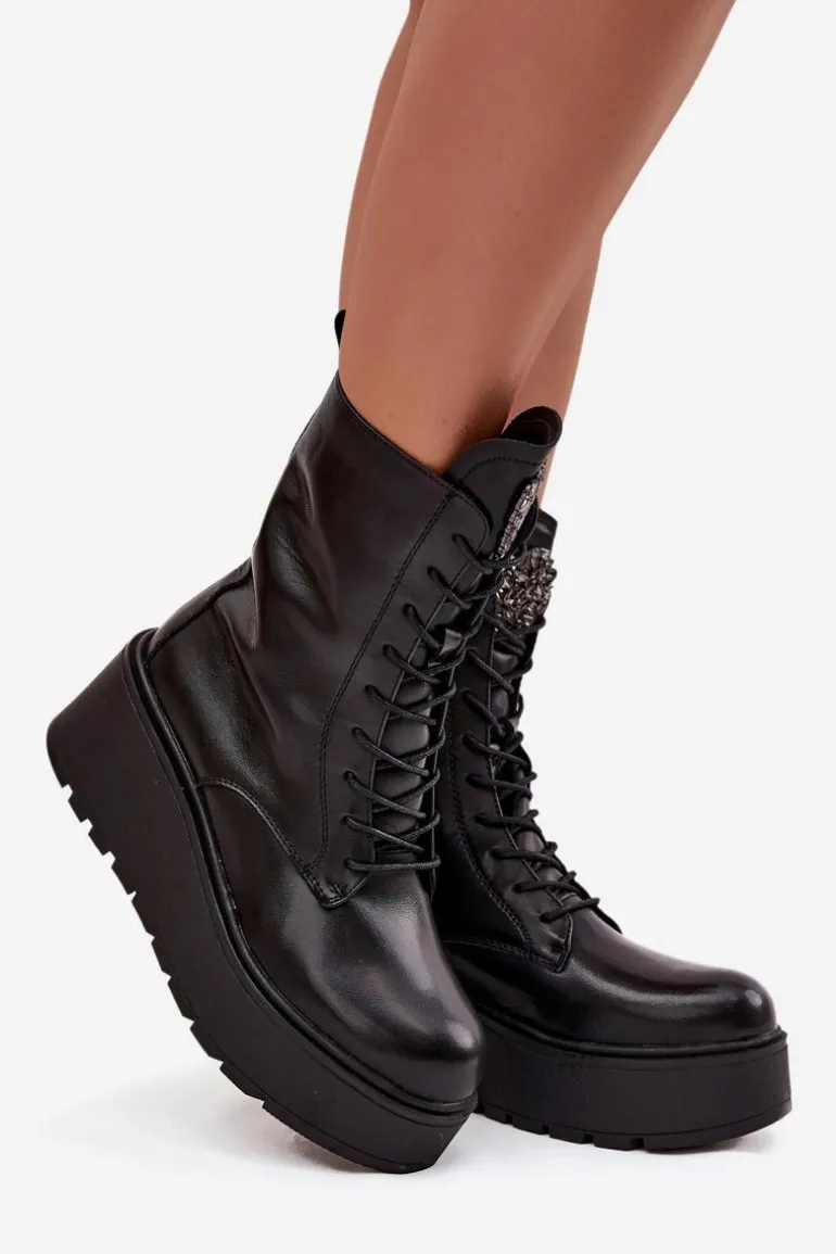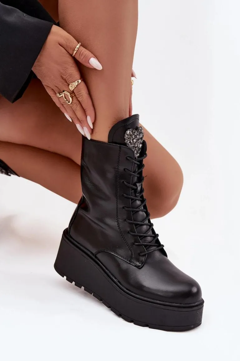 Botki damskie marki Jezzi to propozycja dla kobiet, które cenią wygodę połączoną z modnym wyglądem. Wykonane z naturalnej skóry, wyróżniają się trwałością oraz eleganckim wyglądem. Osadzone na stabilnym koturnie z platformą, optycznie wydłużają sylwetkę, jednocześnie zapewniając komfort podczas noszenia. Wnętrze butów zostało ocieplone, dzięki czemu sprawdzą się one idealnie w chłodniejsze dni sezonu jesienno-zimowego. Model posiada sznurowanie i boczny zamek, co ułatwia dopasowanie oraz szybkie zakładanie. Szczególną uwagę zwracają błyszczące kryształki umieszczone na języku, układające się w kształt serca – ten ozdobny detal dodaje wyjątkowego uroku i podkreśla ich kobiecy charakter. To obuwie, które doskonale pasuje zarówno do codziennych, jak i bardziej eleganckich stylizacji, stając się oryginalnym akcentem w garderobie. Przy wyborze rozmiaru prosimy sugerować się tabelą rozmiarów.