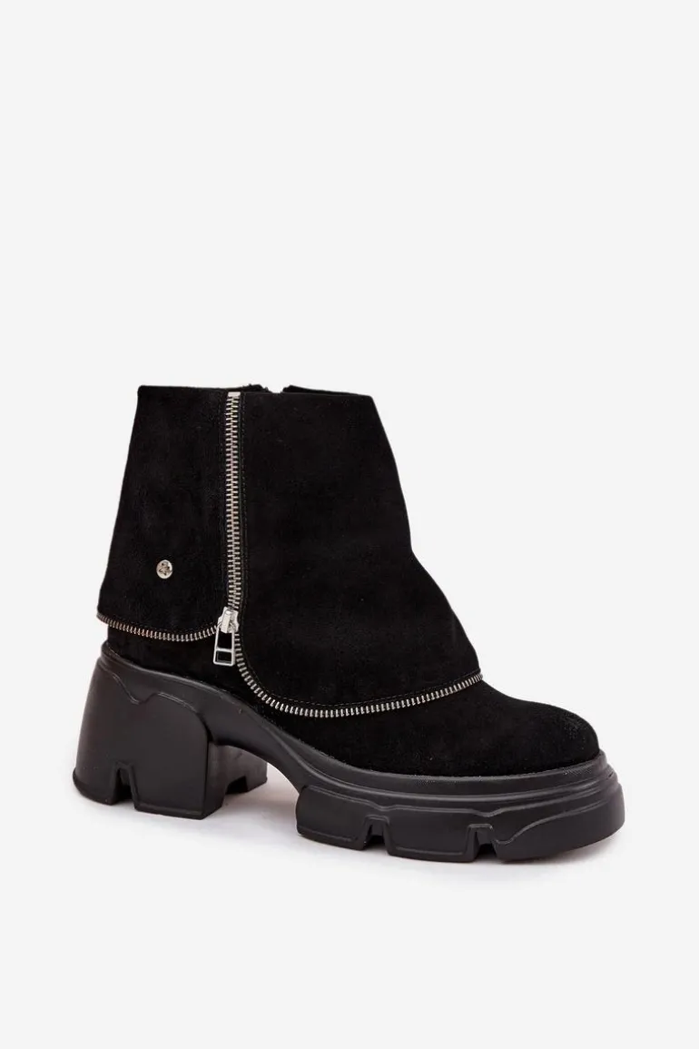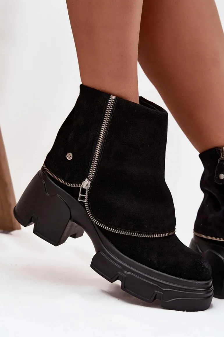 Botki damskie marki Maciejka to propozycja, która łączy oryginalny wygląd z wygodą użytkowania. Wykonane z wysokiej jakości naturalnej skóry, prezentują się elegancko i są niezwykle trwałe. Model został osadzony na stabilnym obcasie w formie klocka oraz platformie, co zapewnia komfort i pewność kroków. Charakterystycznym elementem butów jest efekt wywiniętej cholewki, który nadaje im nietuzinkowego stylu i sprawia, że wyróżniają się na tle klasycznych modeli. Wnętrze ocieplone miękkim, przyjemnym w dotyku materiałem gwarantuje ciepło i wygodę w chłodniejsze dni. Dzięki praktycznemu zapięciu na zamek botki są łatwe w zakładaniu i zdejmowaniu. To oryginalny i stylowy model, który świetnie uzupełni jesienno-zimowe stylizacje, dodając im elegancji i charakteru. Przy wyborze rozmiaru prosimy sugerować się tabelą rozmiarów.