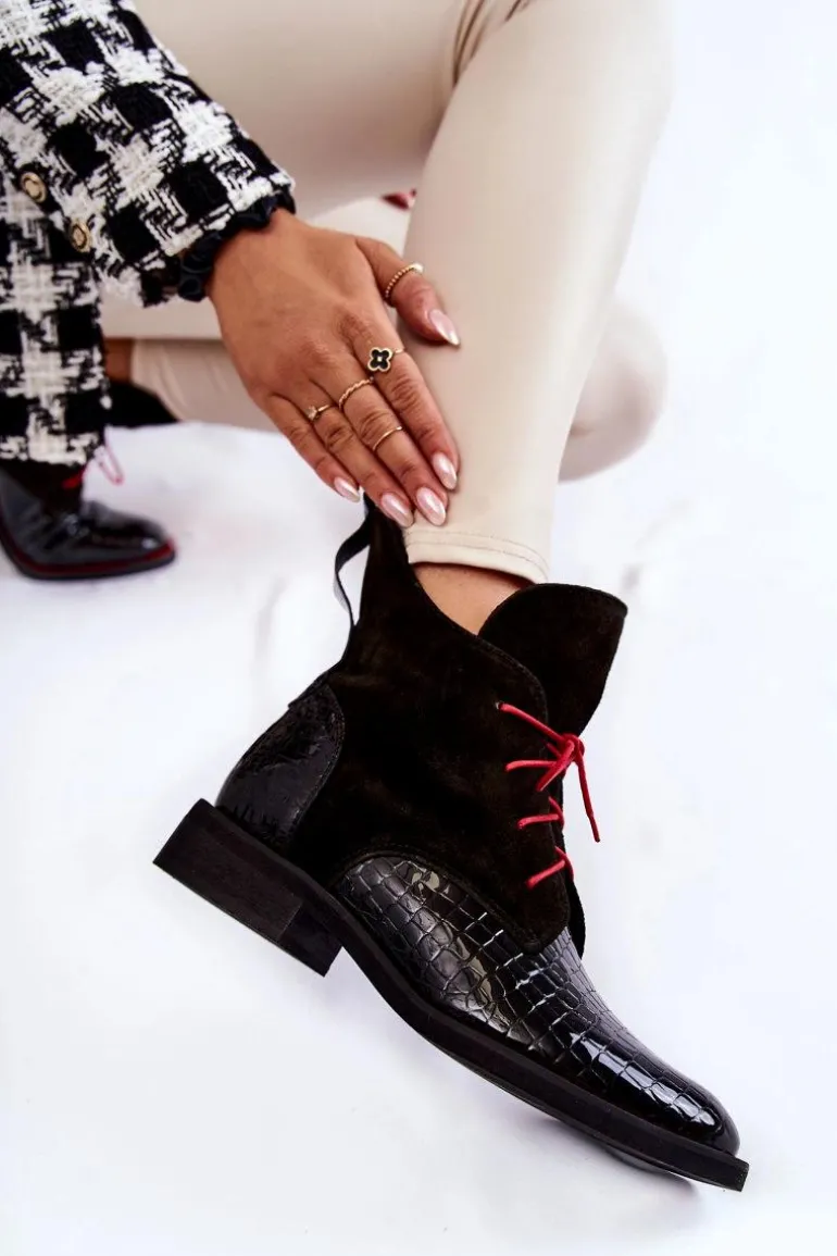 Wyjątkowe botki od polskiego producenta. Buty cechuje wysoka jakość wykonania oraz dbałość o detale. Botki wykonano ręcznie z lakierowanej skóry naturalnej oraz zamszu Skórzana wkładka, oraz wygodny obcas zapewnią maksymalny komfort! Dzięki pięknie zdobionej cholewce buty wzbogacą wszystkie Twoje stylizacje. Przy wyborze rozmiaru prosimy sugerować się tabelą rozmiarów.