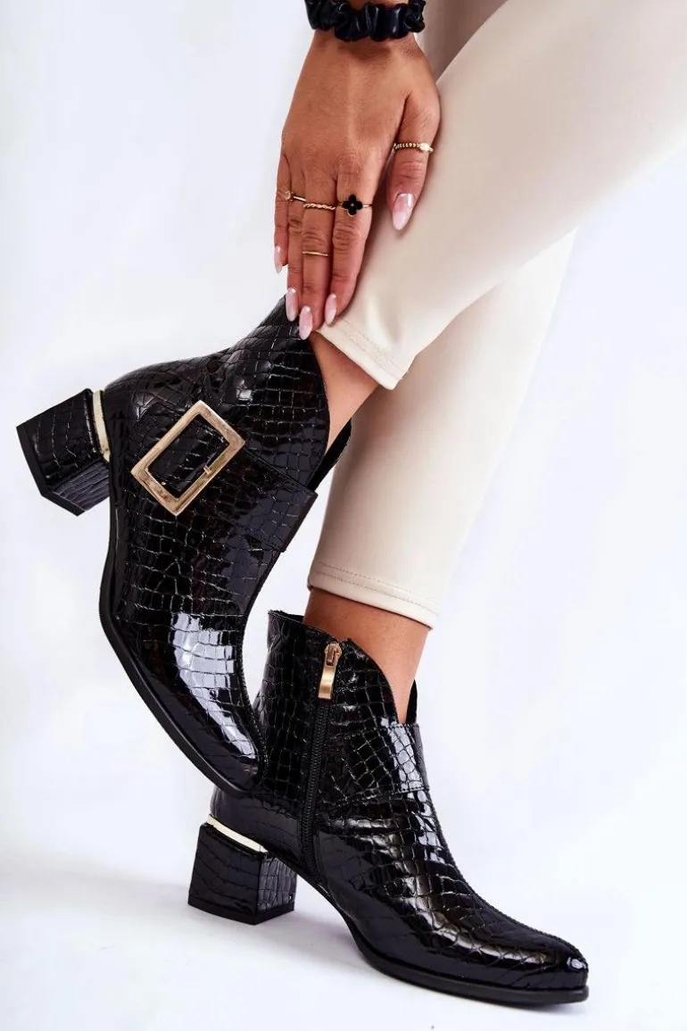 Botki damskie zostały wykonane z wysokiej jakości naturalnej skóry. Model został osadzony na niskim obcasie w postaci klocka. Botki są zapinane na zamek błyskawiczny. Posiadają ozdobną klamrę. Wewnątrz zostały ocieplone kocem obuwniczym. Ten model to idealny wybór na jesienne, chłodne dni. Powinnaś go mieć! Przy wyborze rozmiaru prosimy sugerować się tabelą rozmiarów.