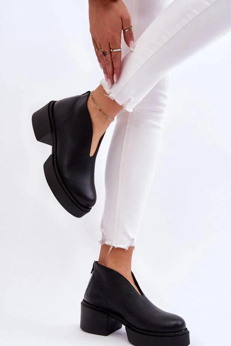 Modne botki damskie na masywnym obcasie i platformie zostały wykonane z naturalnej skóry. Model ten jest zapinany na suwak z tyłu cholewki. Dodatkowo zapiętek w tych botkach jest usztywniany. Miękka i wygodna wkładka została wykonana z naturalnej skóry. Te botki powinny znaleźć się w twojej szafie! Przy wyborze rozmiaru prosimy sugerować się tabelą rozmiarów.