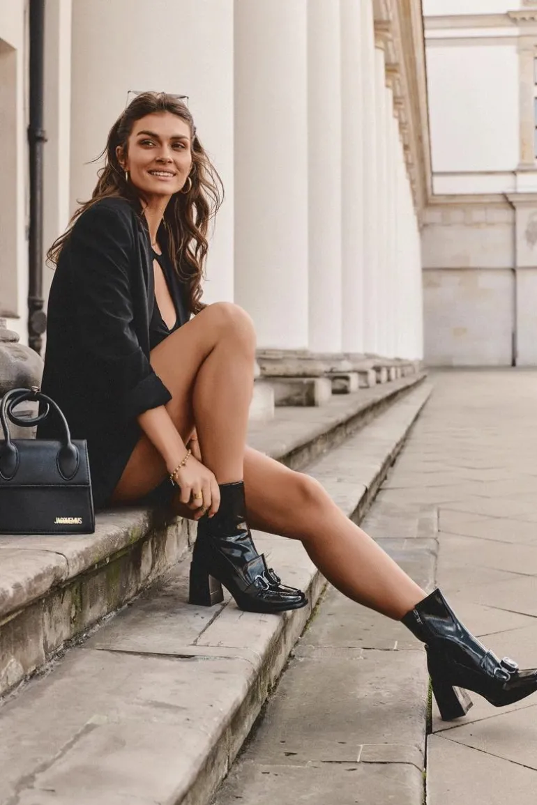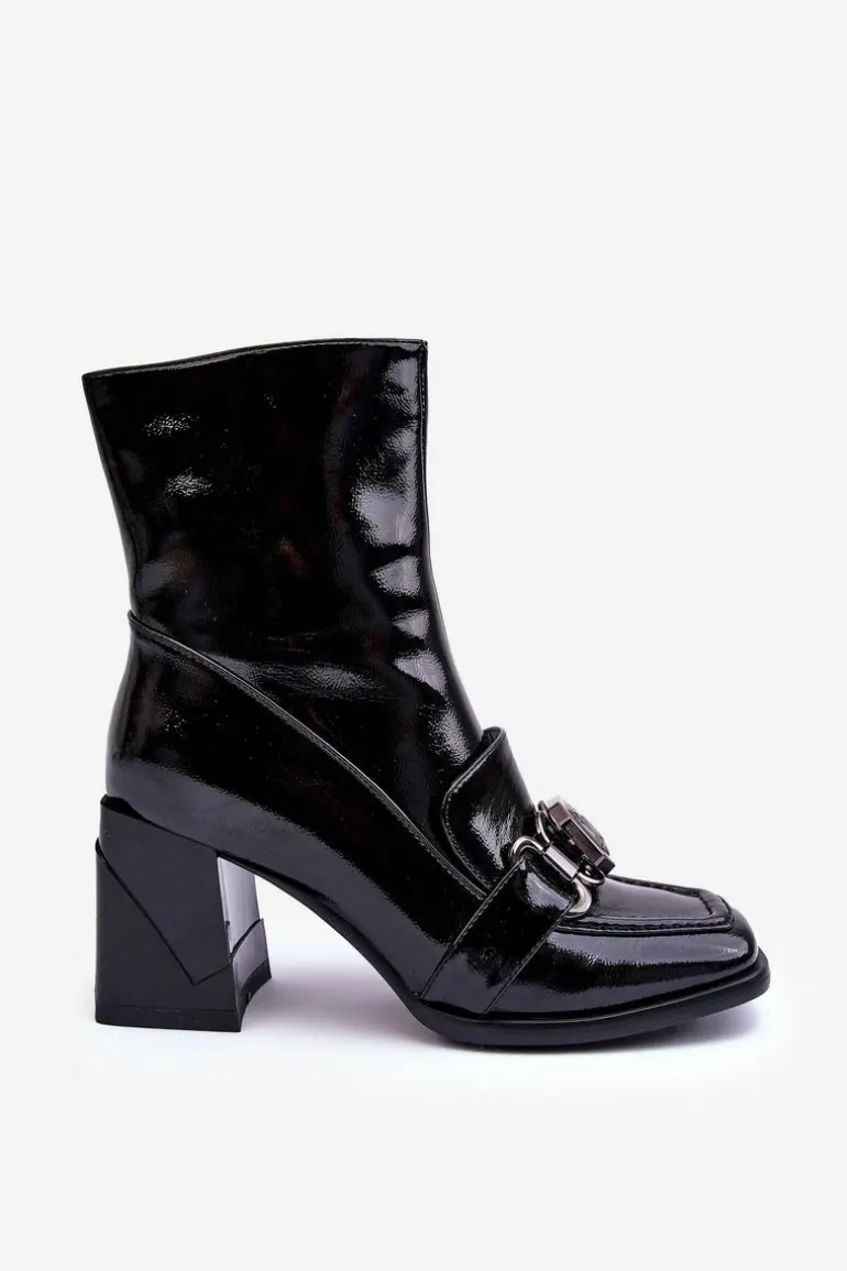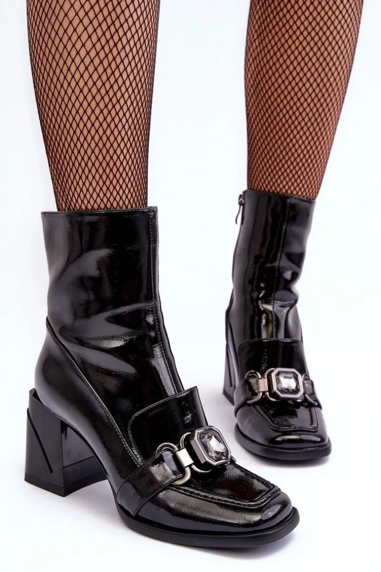Botki damskie osadzone na masywnym obcasie. Wykonane z eko skóry. Na pasku z przodu znajduje się ozdoba. Noski w kwadrat. Środek ocieplony kocem obuwniczym. Miękka wkładka zapewni komfortowe użytkowanie obuwia. Dodatkowo zapiętek jest usztywniony. Przy wyborze rozmiaru prosimy sugerować się tabelą rozmiarów.