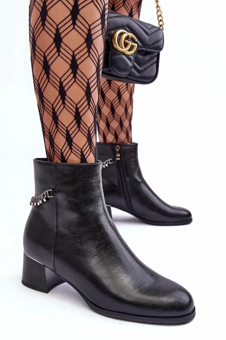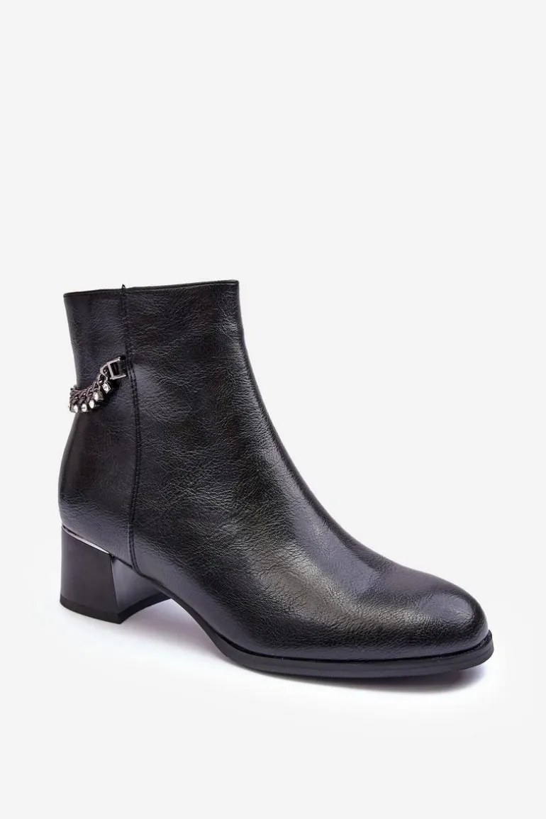 Klasyczne botki damskie osadzone na niskim obcasie z lustrzanym elementem. Wykonane z eko skóry. Zapinane na suwak po wewnętrznej stronie. Cholewka ozdobiona łańcuchem z dżetami. Wnętrze ocieplone kocem obuwniczym. Zapiętek usztywniony, noski zaokrąglone. Przy wyborze rozmiaru prosimy sugerować się tabelą rozmiarów.