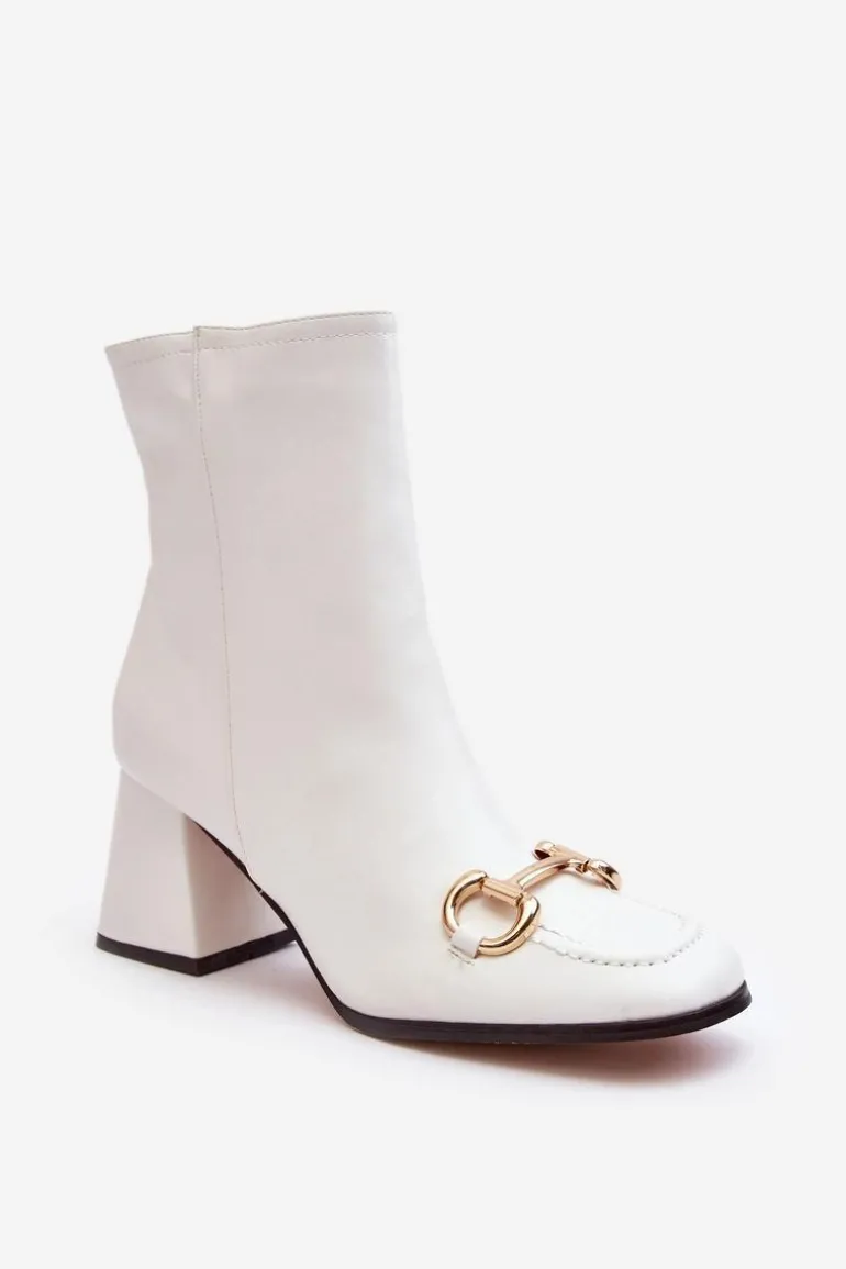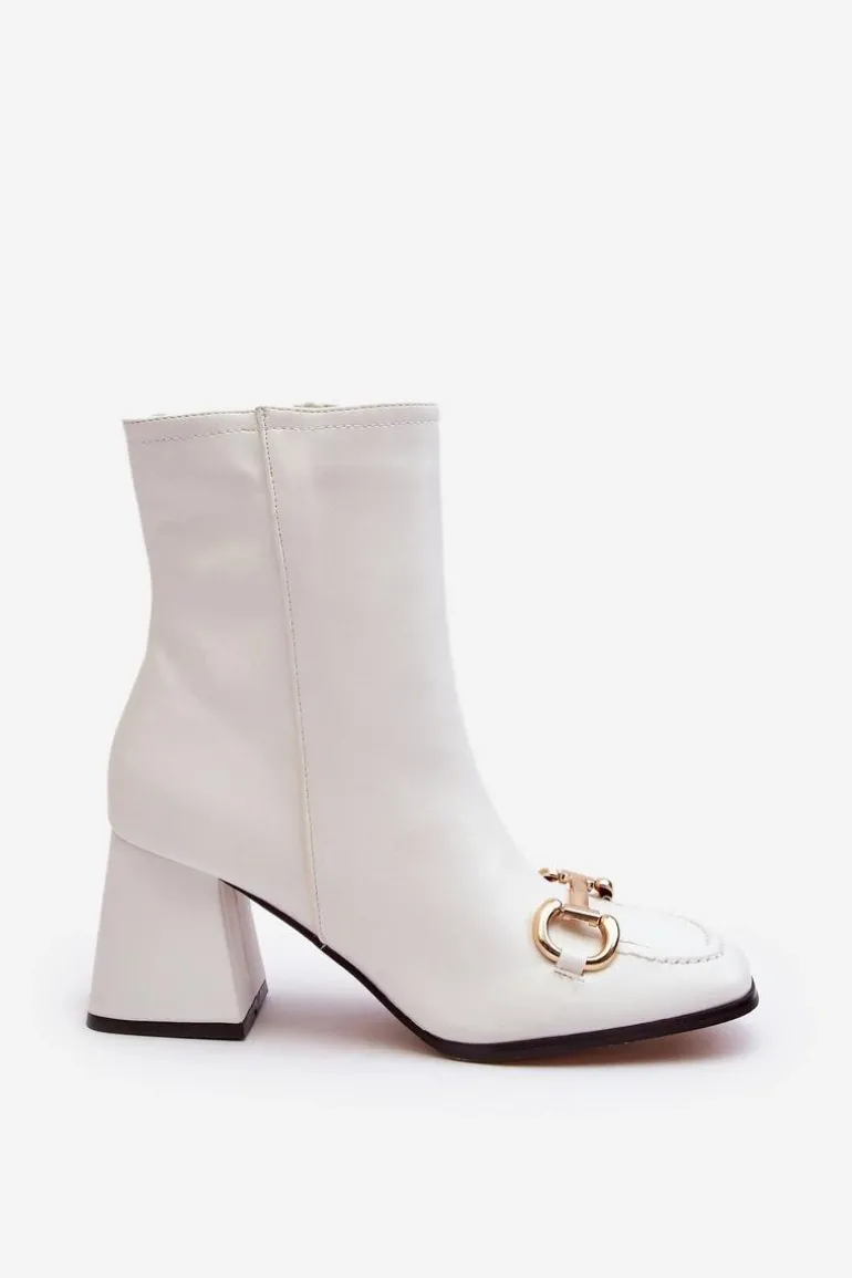 Botki damskie zostały wykonane z eko skóry. Zapinane na suwak z boku. Obcas w postaci klocka. Z przodu złota ozdoba z tworzywa sztucznego. Zapiętek jest usztywniony, noski w kwadrat. Ten model powinien znaleźć się w Twojej szafie! Przy wyborze rozmiaru prosimy sugerować się tabelą rozmiarów.