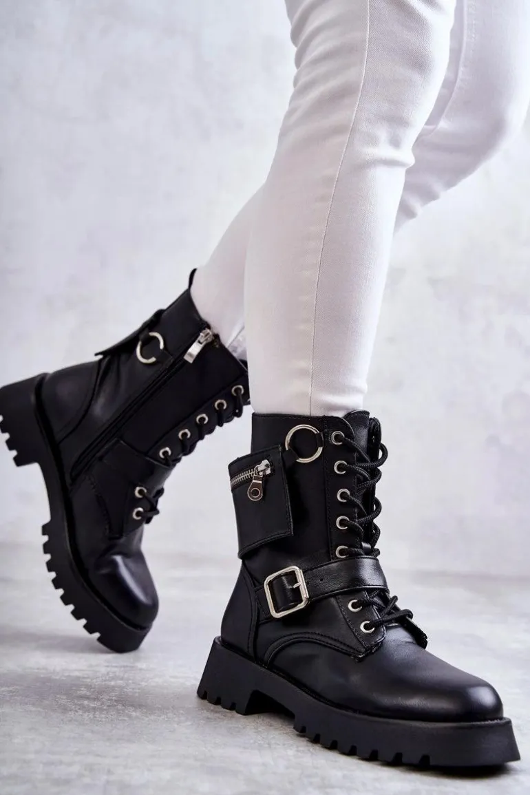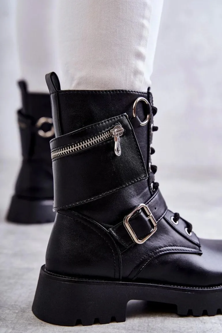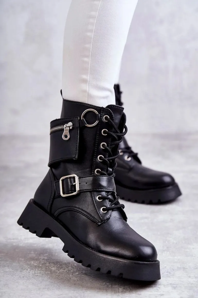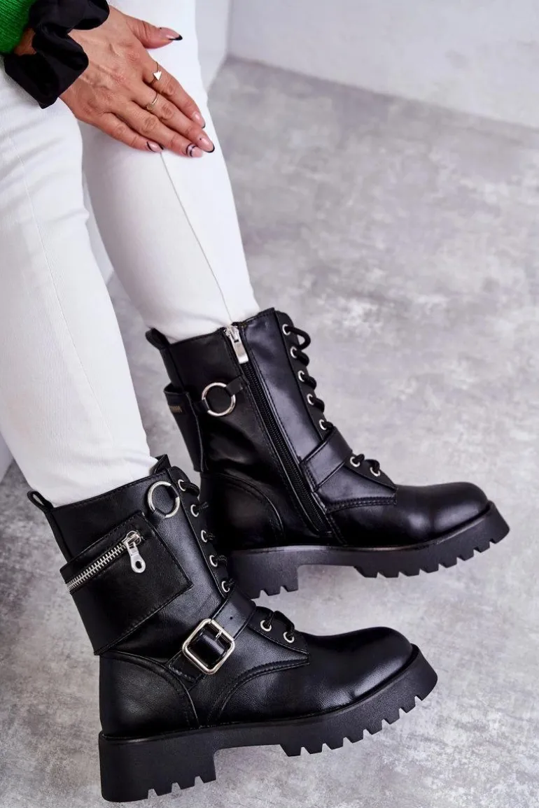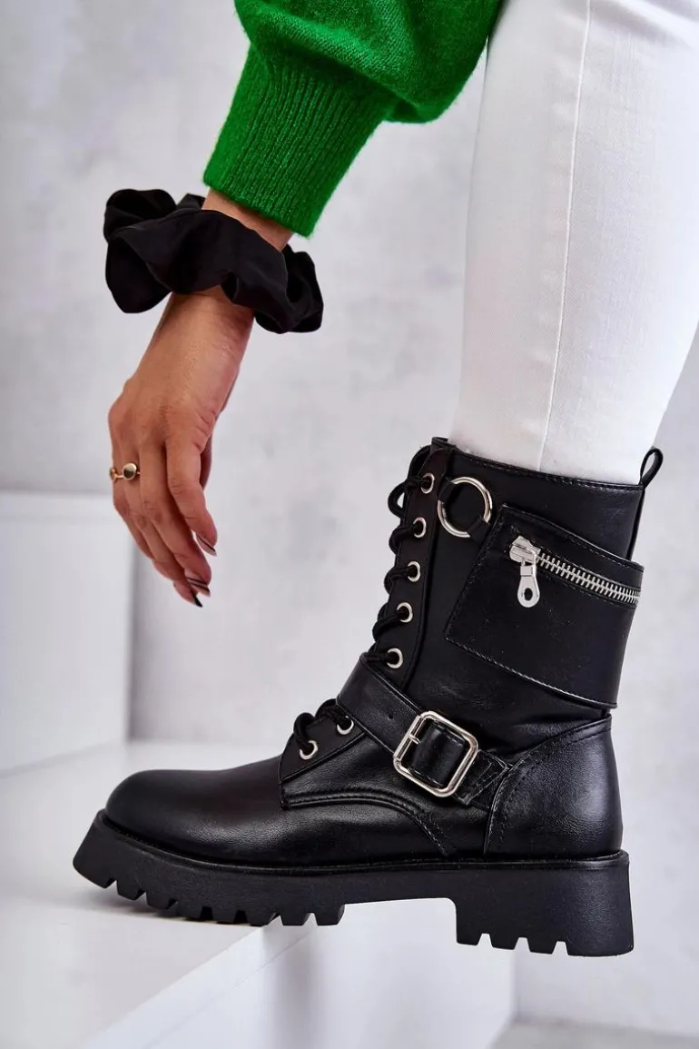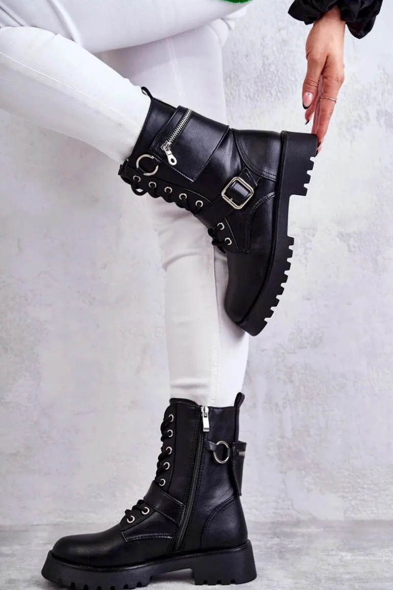 Klasyczne botki damskie wykonane z eko skóry posiadają ozdobne paski na cholewce. Model sznurowany, z suwakiem z boku cholewki. Zostały osadzone na płaskim obcasie i delikatnej platformie ze żłobieniami. Posiadają w środku ocieplenie w postaci koca obuwniczego oraz usztywniany zapiętek. Koniecznie powinnaś je mieć! Przy wyborze rozmiaru prosimy sugerować się tabelą rozmiarów.
