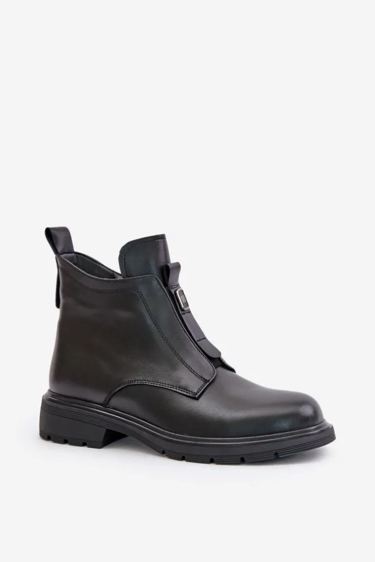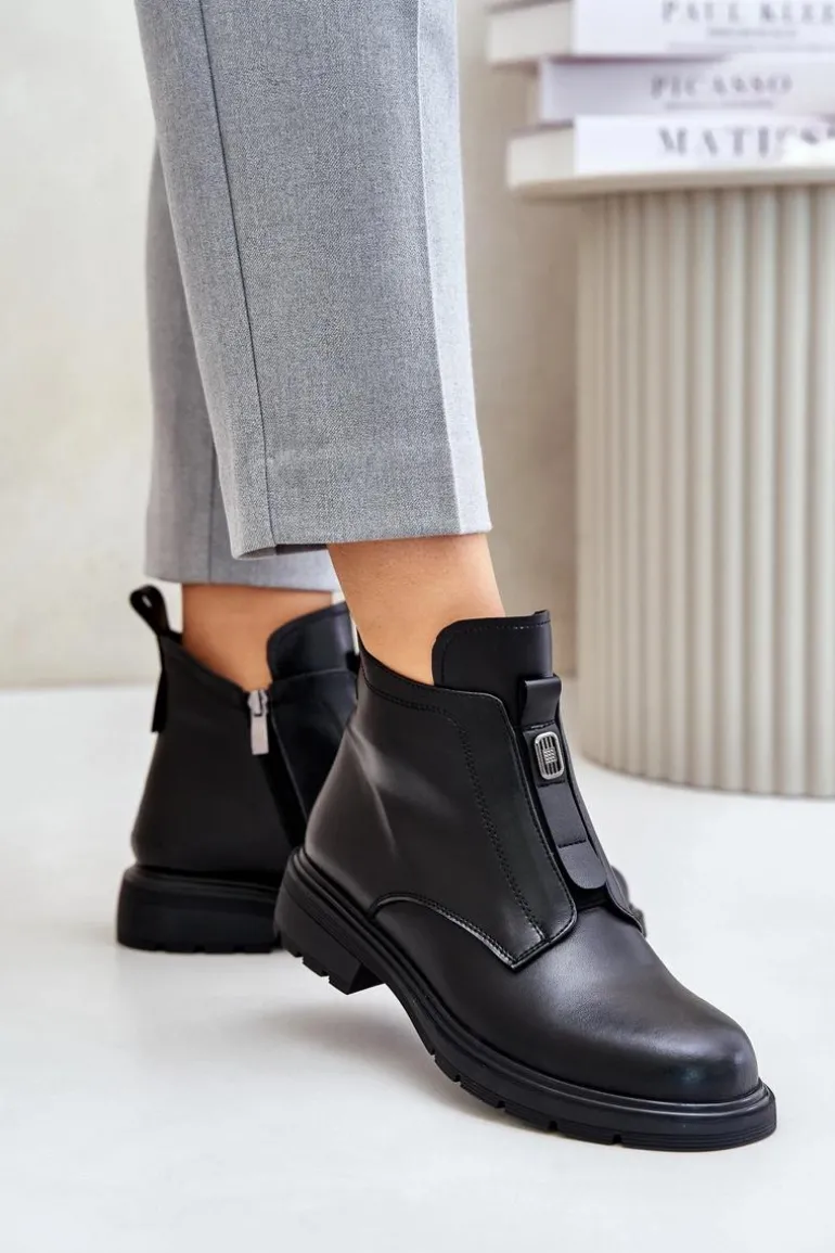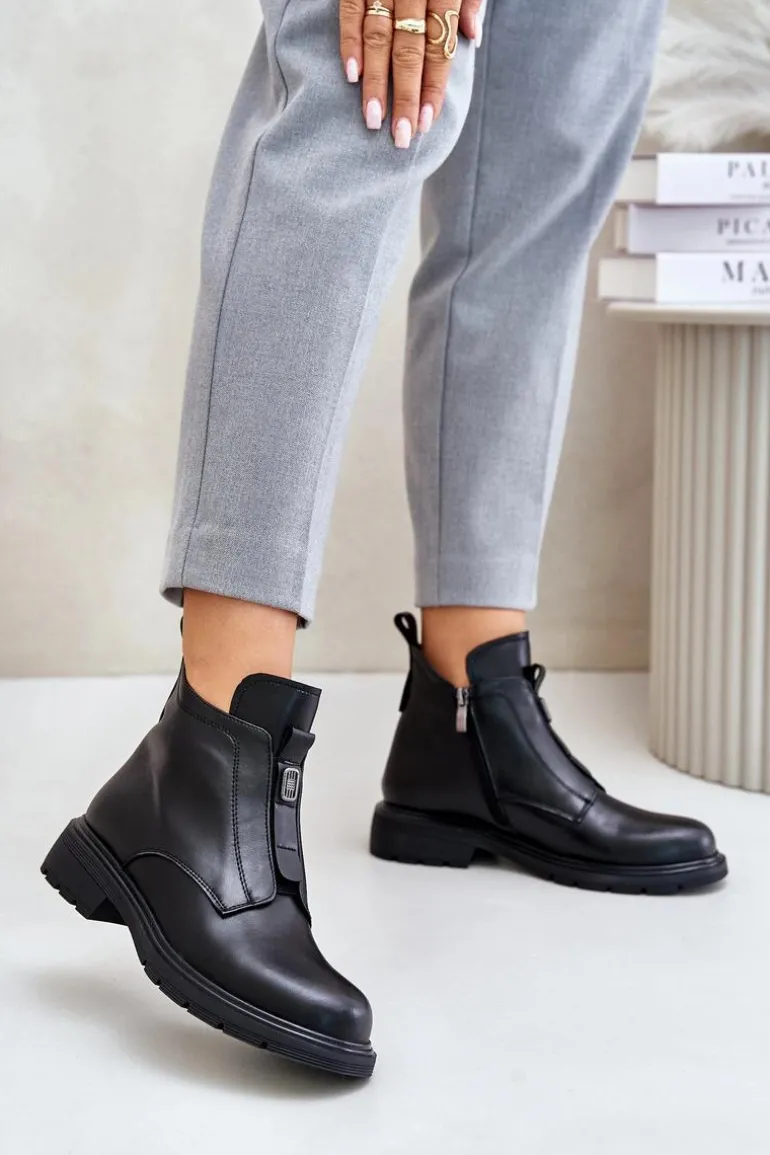 Damskie botki na płaskim obcasie, wykonane z wysokiej jakości naturalnej skóry, to stylowa i funkcjonalna opcja na chłodniejsze dni. Sięgające za kostkę, posiadają praktyczne zapięcie na zamek, które ułatwia zakładanie. Z przodu buty zdobi subtelny detal. Ocieplenie kocem obuwniczym, zapewni ciepło i komfort, idealnie wpisując się w codzienne, jesienno-zimowe stylizacje. Przy wyborze rozmiaru prosimy sugerować się tabelą rozmiarów.