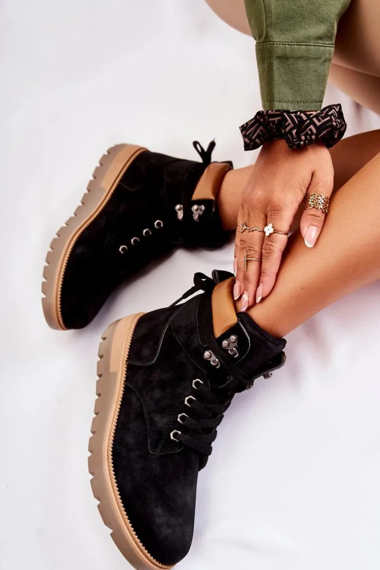 Botki damskie zostały wykonane z eko skóry. Model osadzony jest na platformie z charakterystycznymi żłobieniami. Posiadają zaokrąglony nosek. Cholewka zakrywająca kostkę z małą pętelką z tyłu ułatwiającą zakładanie obuwia. Wkładka oraz wyściółka ocieplone kocem obuwniczym. Klasyczne wiązanie na płaskie sznurowadła pozwoli na odpowiednie dopasowanie obuwia do tęgości nogi. Przy wyborze rozmiaru prosimy sugerować się tabelą rozmiarów.