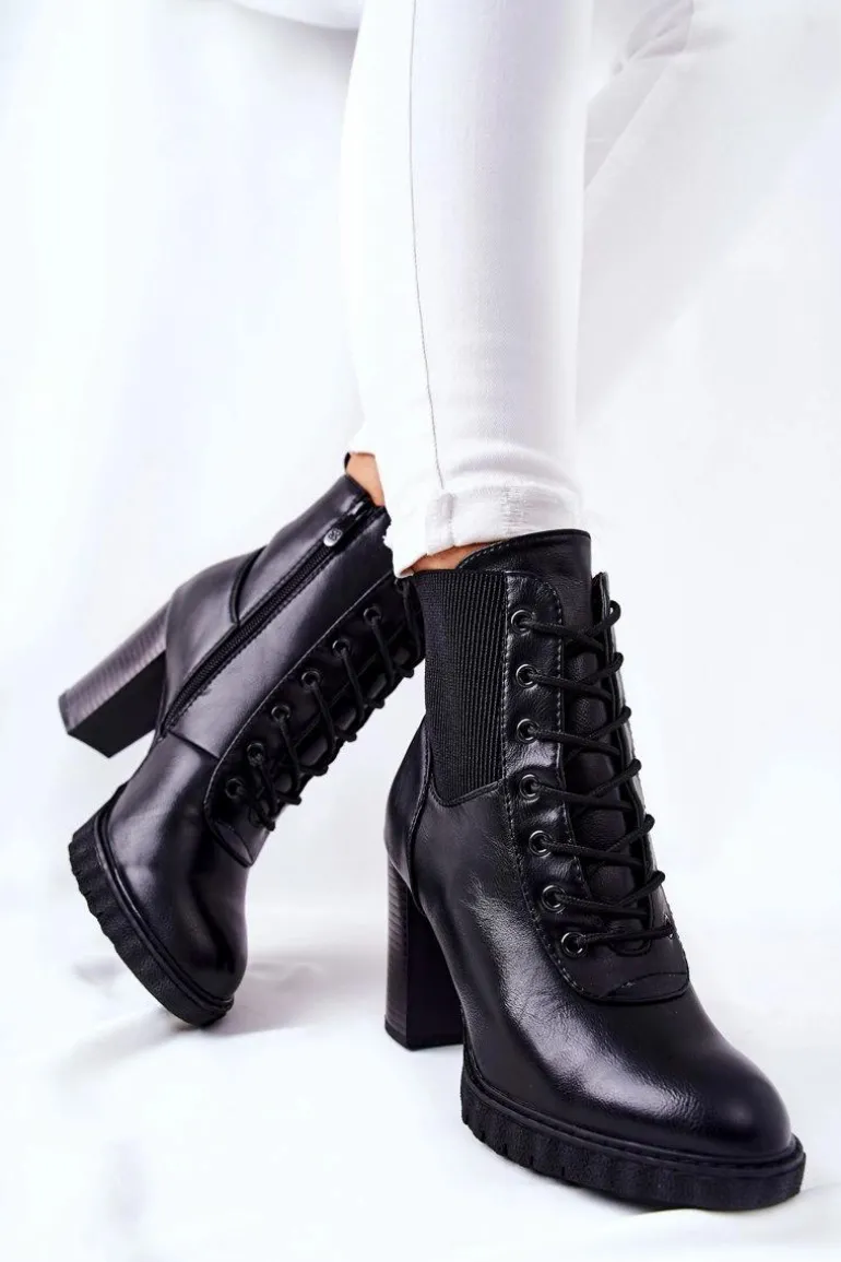 Botki posiadają ściągacz, który pozwoli na dopasowanie do nogi. Klasyczny fason idealnie będzie pasować do wielu stylizacji. Obcas w postaci słupka. Buty posiadają wiązanie oraz suwak. W środku posiadają ocieplenie w postaci koca obuwniczego. Sprawdź także pozostałą ofertę botków !