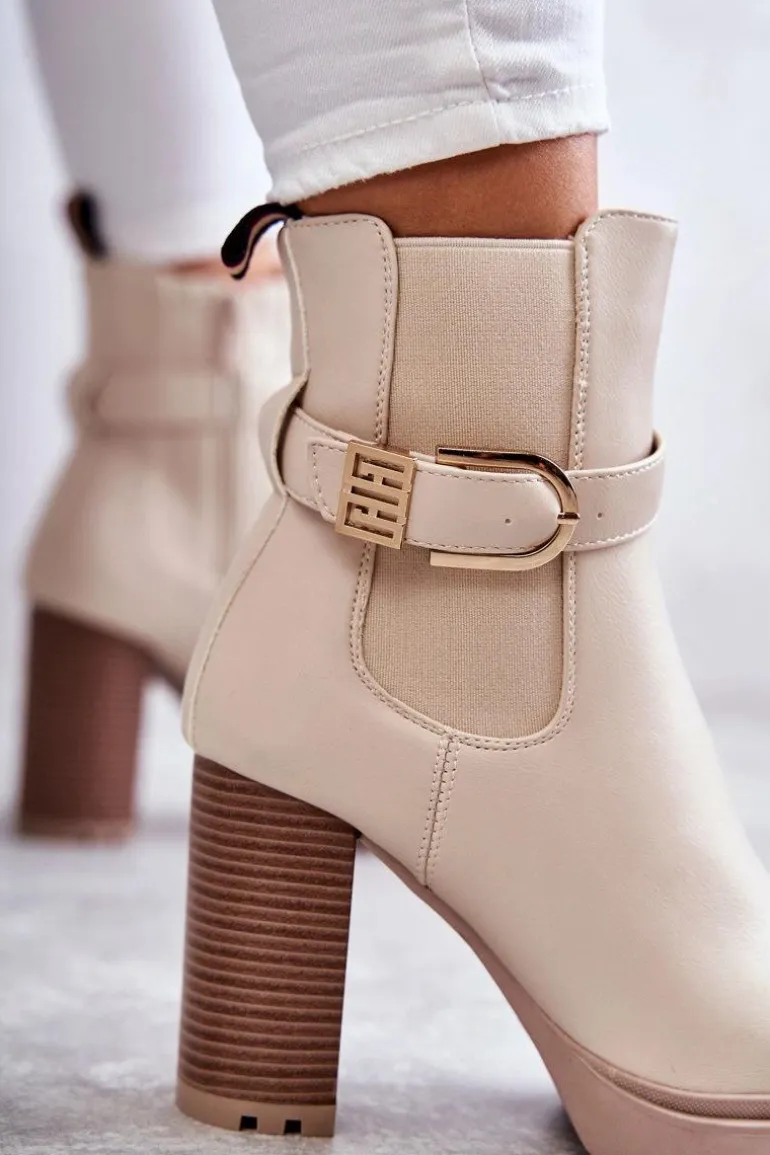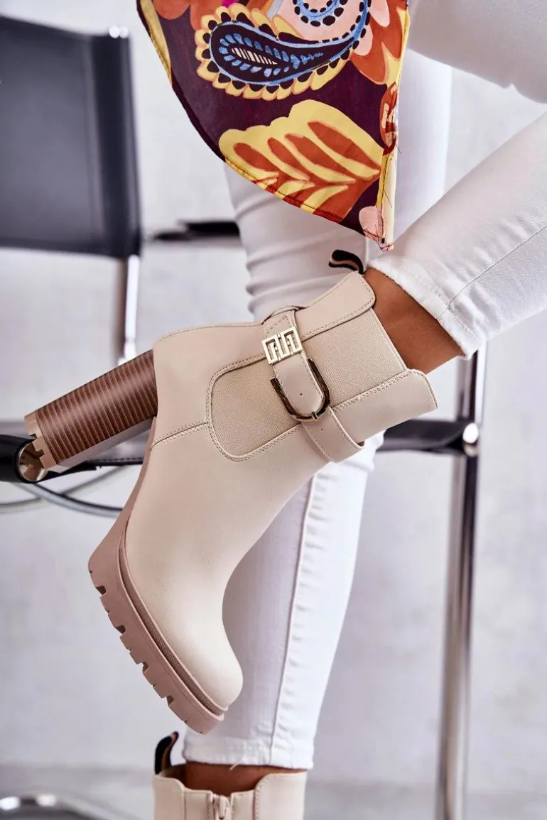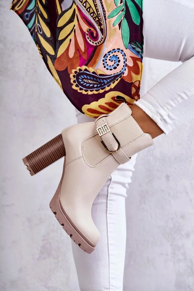 Spójrz tylko na te botki! Klasyka z elegancją w jednym! Botki zostały wykonane ze skóry ekologicznej. Posiadają z boku cholewki regulowany pasek oraz ozdobę. Botki zostały osadzone na obcasie w postaci słupka oraz platformie ze żłobieniami. Po wewnętrznej stronie znajduje się suwak ułatwiający zakładanie obuwia. Zapiętek jest usztywniany. Środek botków został ocieplony kocem obuwniczym. Przy wyborze rozmiaru prosimy sugerować się tabelą rozmiarów.