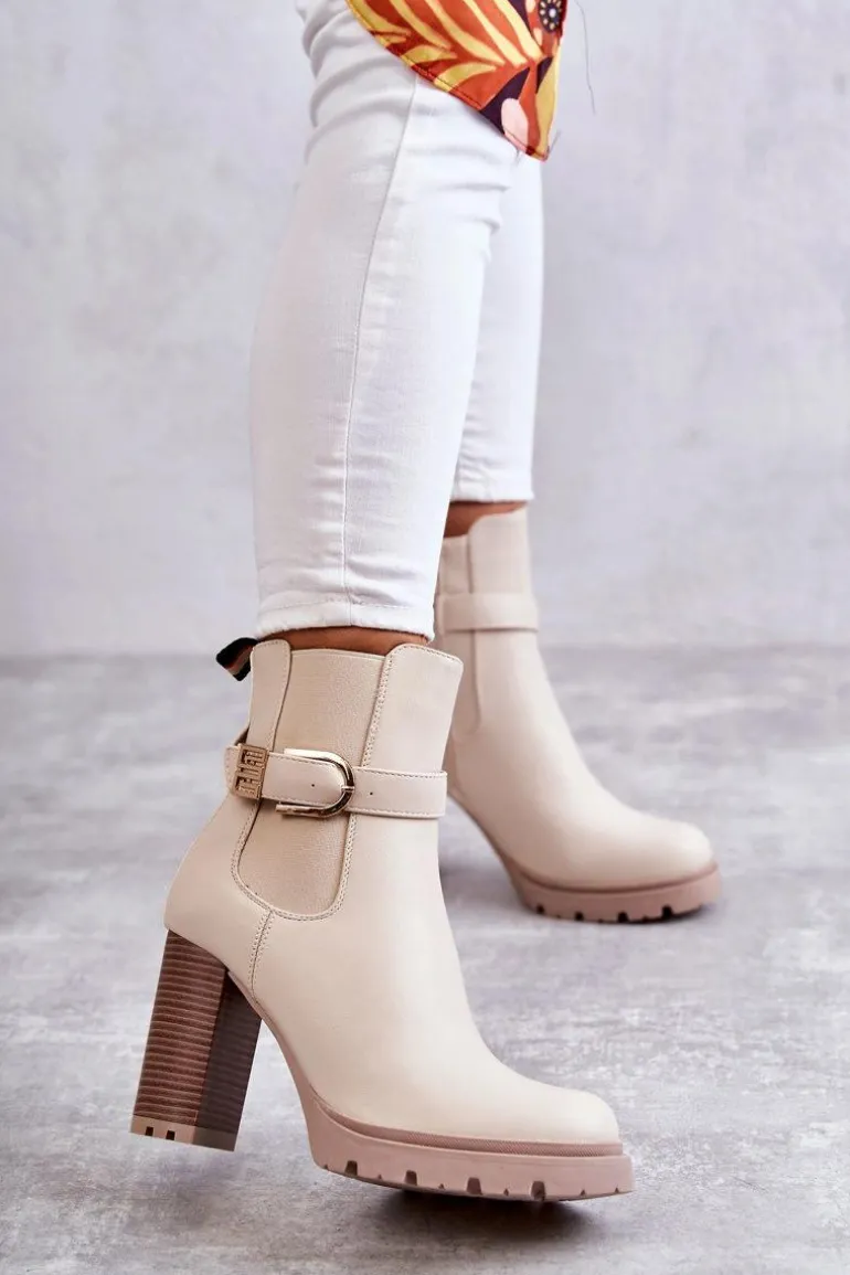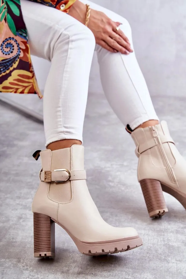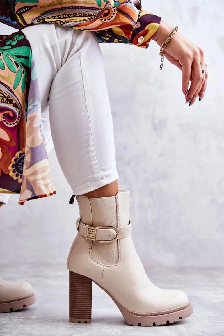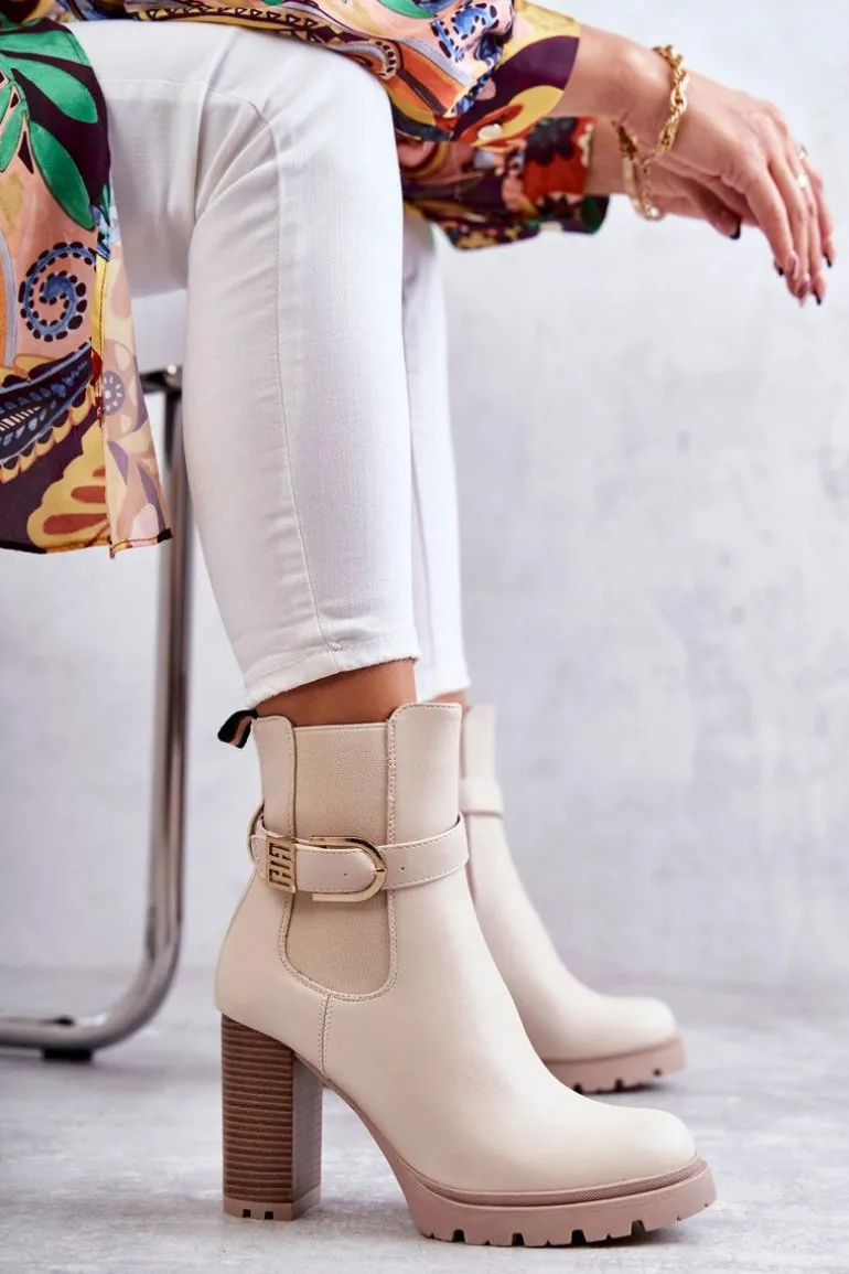 Spójrz tylko na te botki! Klasyka z elegancją w jednym! Botki zostały wykonane ze skóry ekologicznej. Posiadają z boku cholewki regulowany pasek oraz ozdobę. Botki zostały osadzone na obcasie w postaci słupka oraz platformie ze żłobieniami. Po wewnętrznej stronie znajduje się suwak ułatwiający zakładanie obuwia. Zapiętek jest usztywniany. Środek botków został ocieplony kocem obuwniczym. Przy wyborze rozmiaru prosimy sugerować się tabelą rozmiarów.