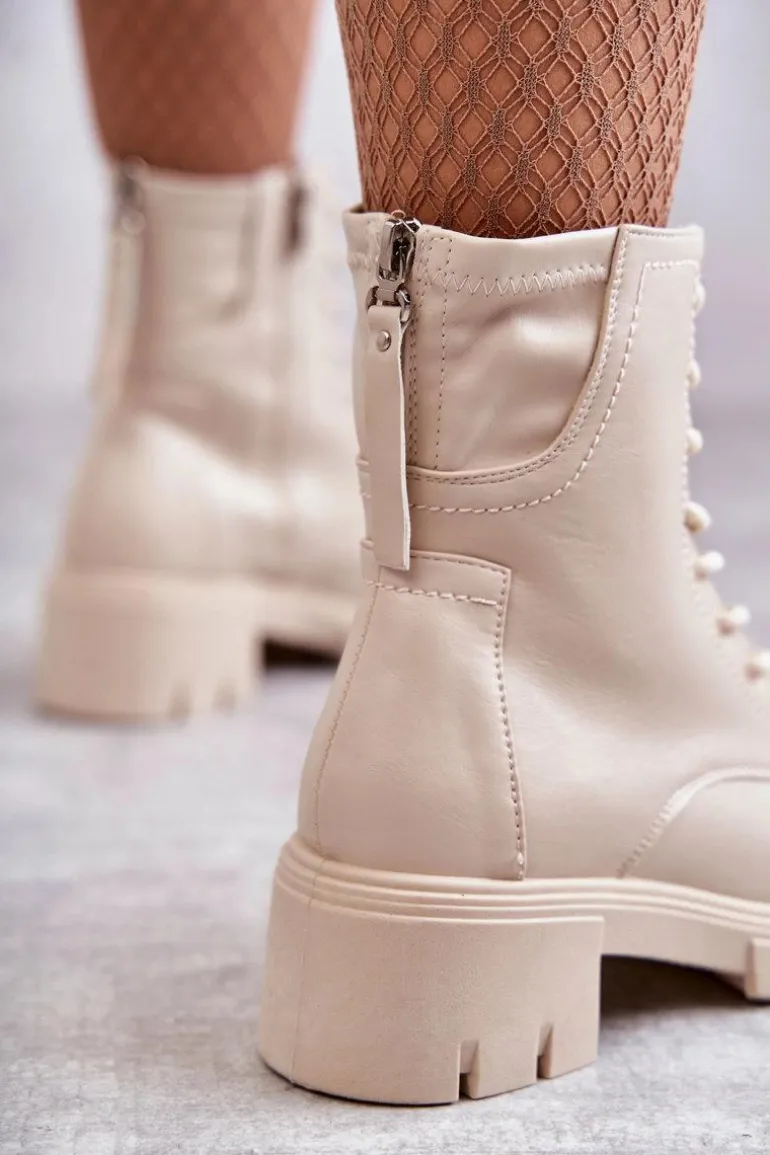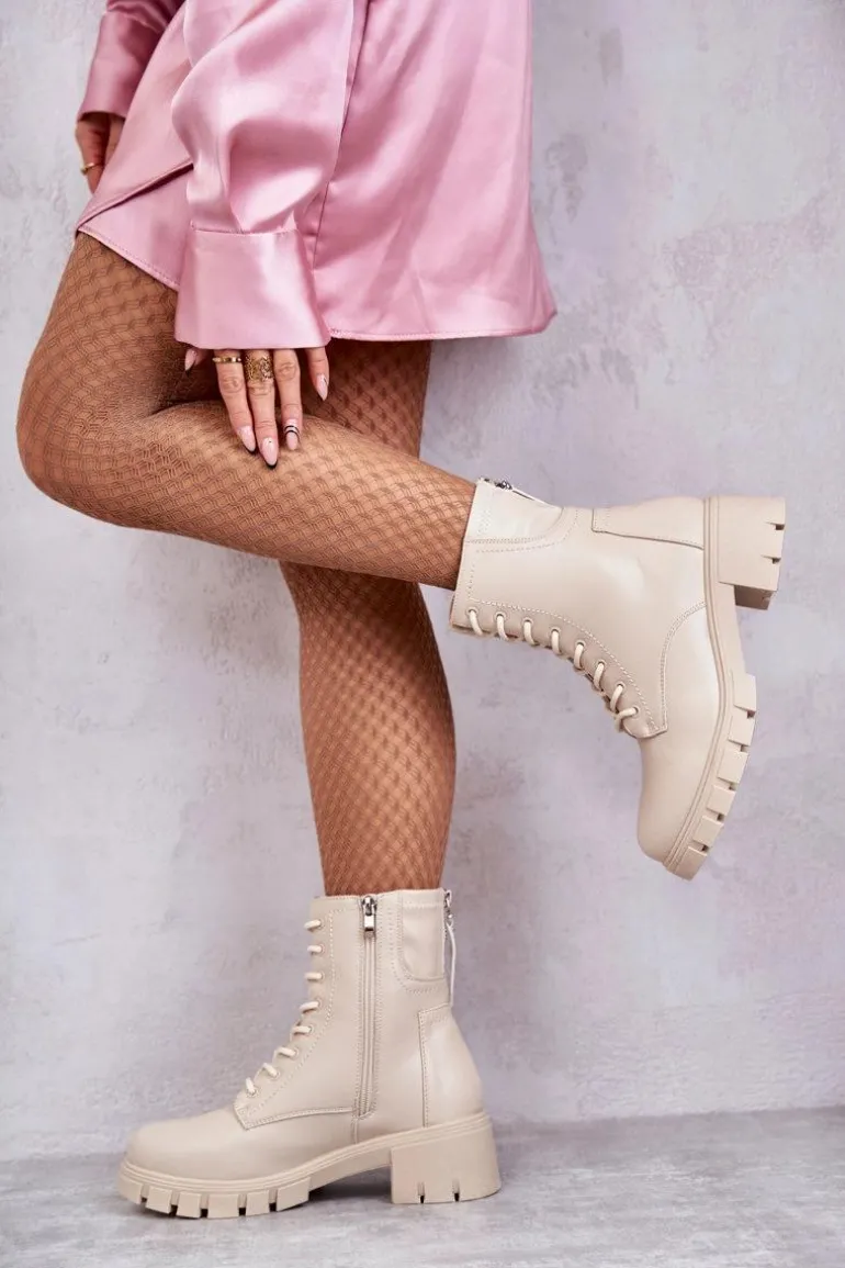 Damskie botki z wyższą cholewką za kostkę zostały wykonane z przyjemnej w dotyku eko skóry. Model ten posiada wiązanie oraz suwak. Osadzone na platformie oraz płaskim obcasie. Podeszwa jest wykonana z gumowego tworzywa. Botki posiadają w środku ocieplenie w postaci miłego w dotyku koca obuwniczego. Zapiętek usztywniany pozwoli na odpowiednią stabilizację stopy. Przy wyborze rozmiaru prosimy sugerować się tabelą rozmiarów.