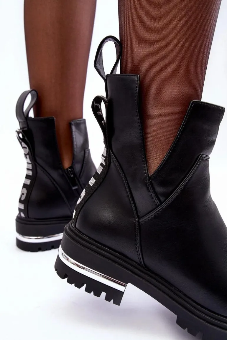 Botki damskie na płaskim obcasie. Wykonane z eko skóry. Wewnątrz ocieplone kocem obuwniczym. Cholewka z wycięciami na bokach. Na obcasie lustrzana ozdoba. Noski zaokrąglone. Model ten z tyłu cholewki posiada napis. Dodatkowo zapiętek jest usztywniony. Przy wyborze rozmiaru prosimy sugerować się tabelą rozmiarów.