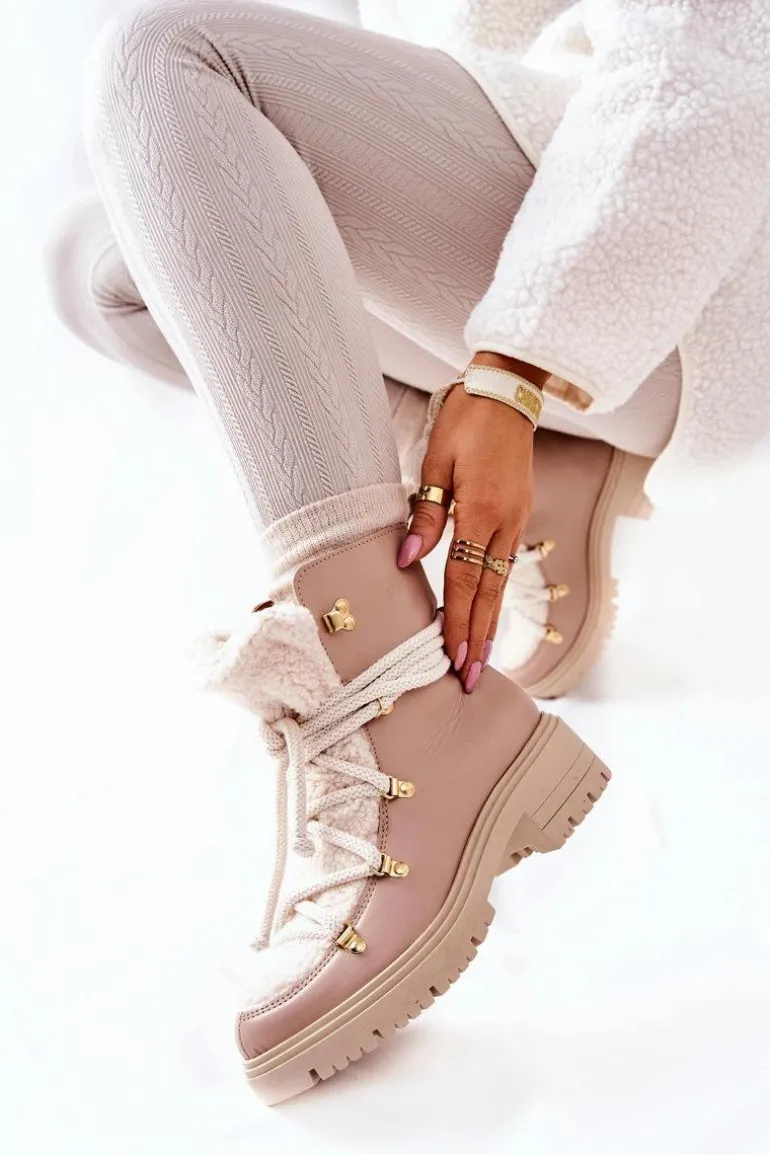 Skórzane Botki Trapery Wiązane Lewski Beżowe 3116