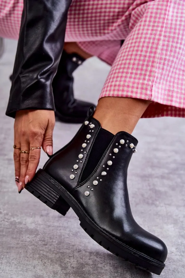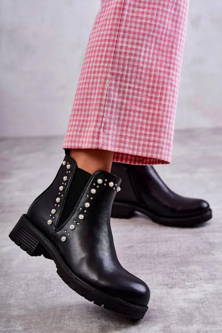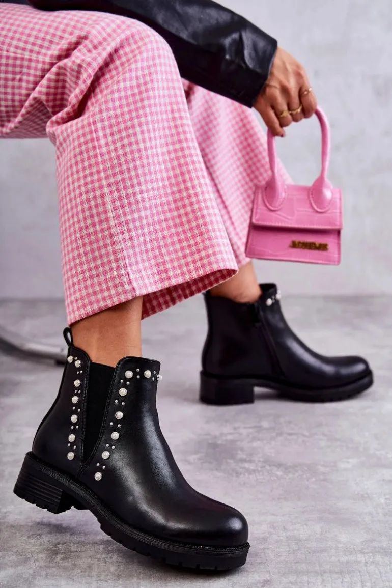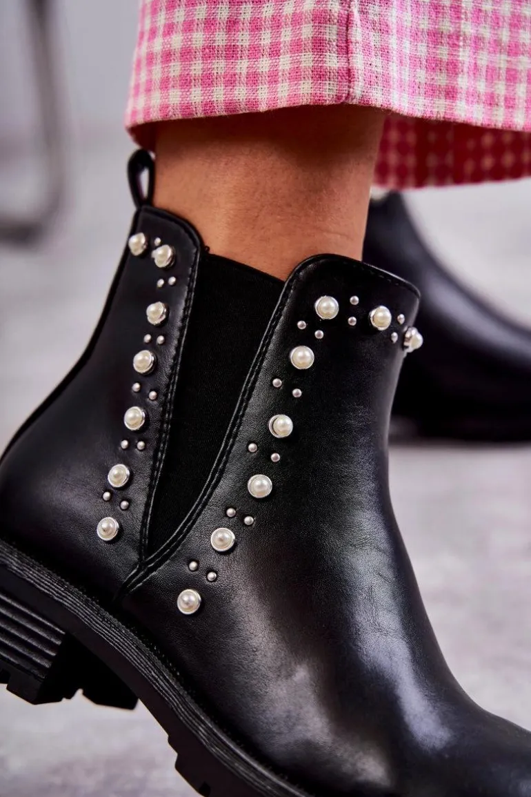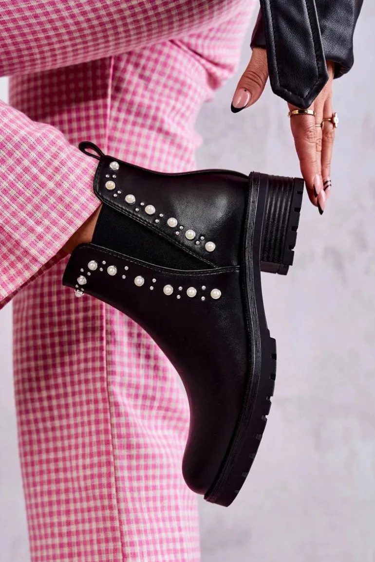Wsuwane botki damskie zostały osadzone na płaskim obcasie i delikatnej platformie. Wykonane z eko skóry z ozdobami na cholewce w postaci ćwieków i perełek. Zapinane na suwak. Botki te posiadają ocieplenie w postaci koca obuwniczego. Model klasyczny, idealny do wielu stylizacji. Koniecznie musisz je mieć! Przy wyborze rozmiaru prosimy sugerować się tabelą rozmiarów.