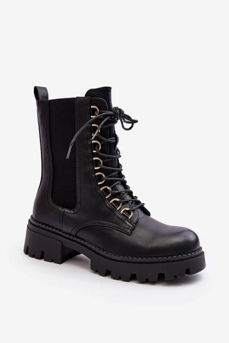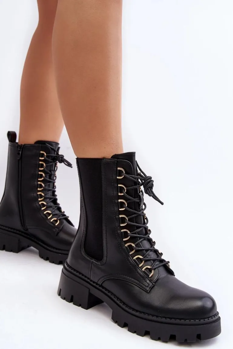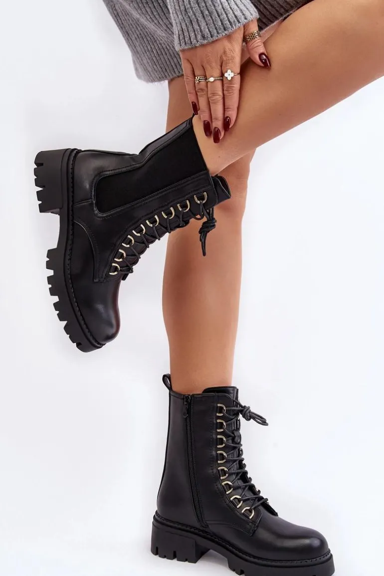 Damskie botki wykonane z eko skóry. Osadzone na płaskim obcasie. Na cholewce elastyczne wstawki. Noski zaokrąglone. Model ten zapinany jest na suwak z boku oraz dodatkowo posiada sznurowanie. Wnętrze ocieplone kocem obuwniczym. Świetny model do jesiennych i zimowych stylizacji! Przy wyborze rozmiaru prosimy sugerować się tabelą rozmiarów.