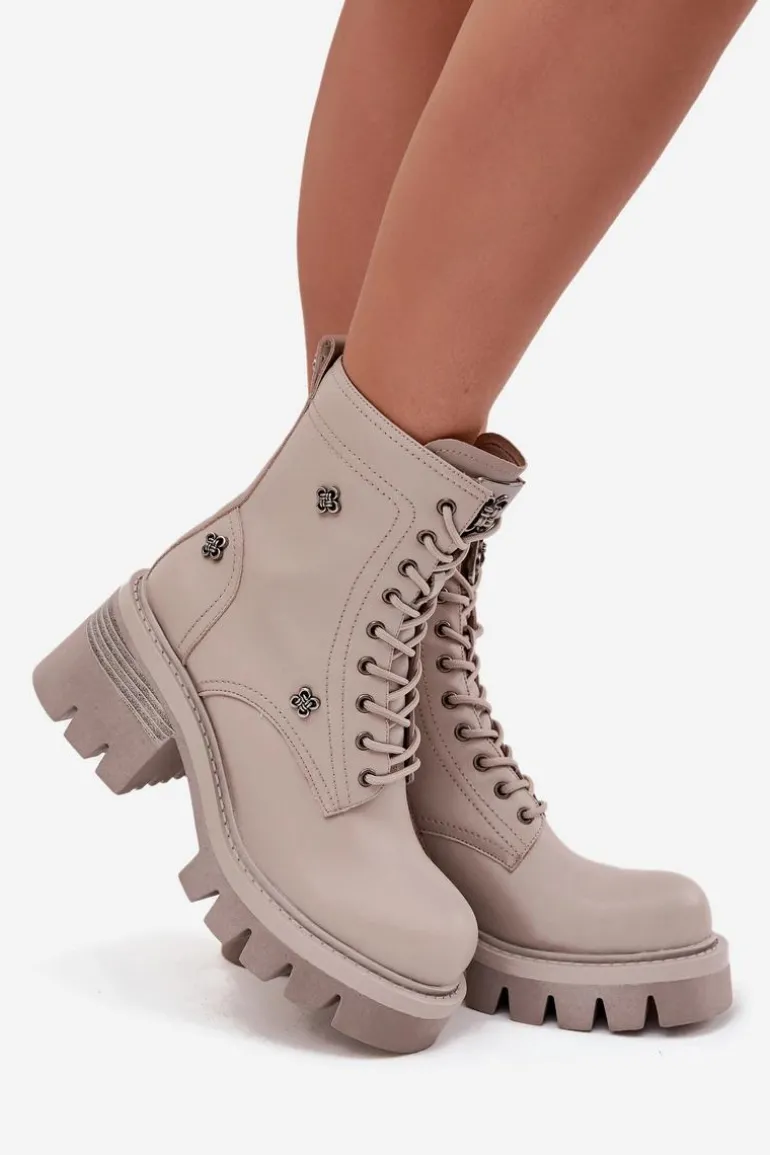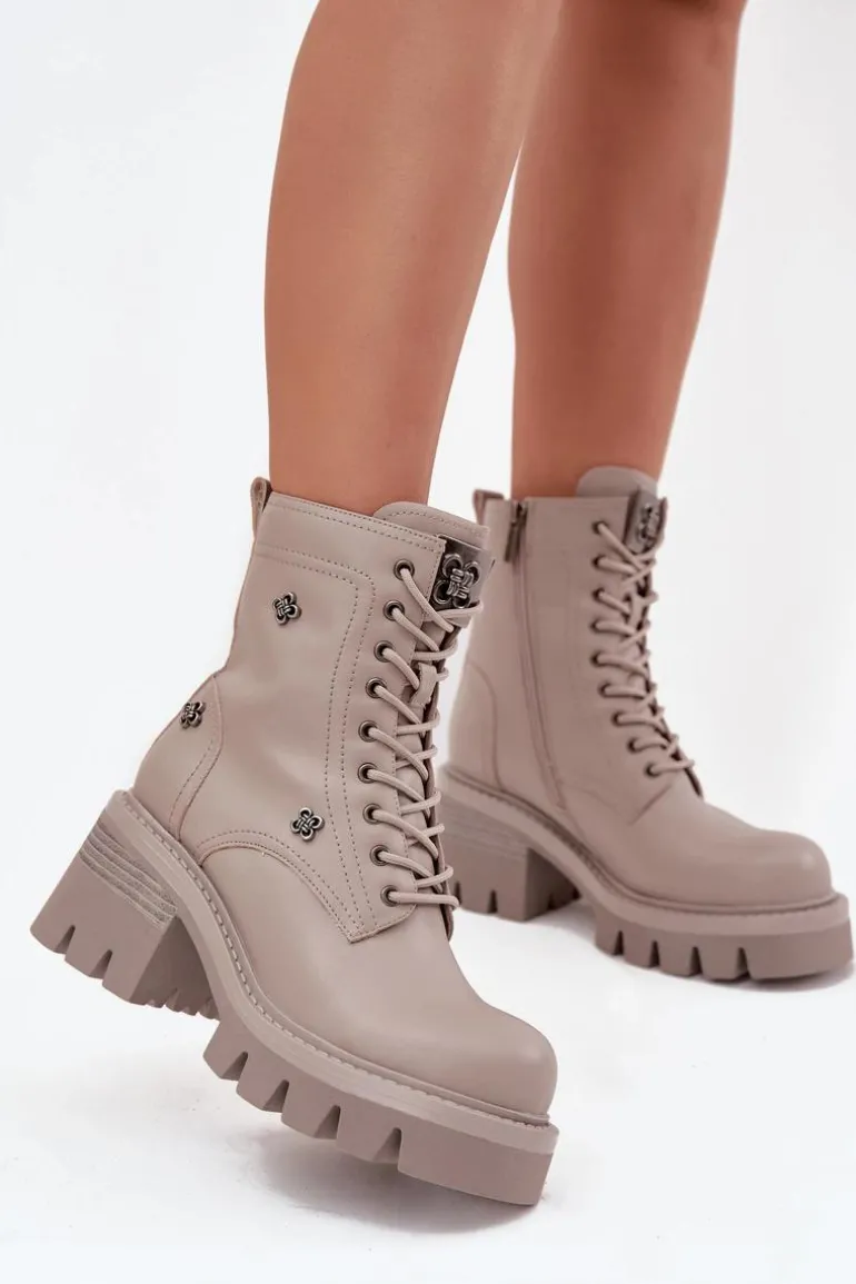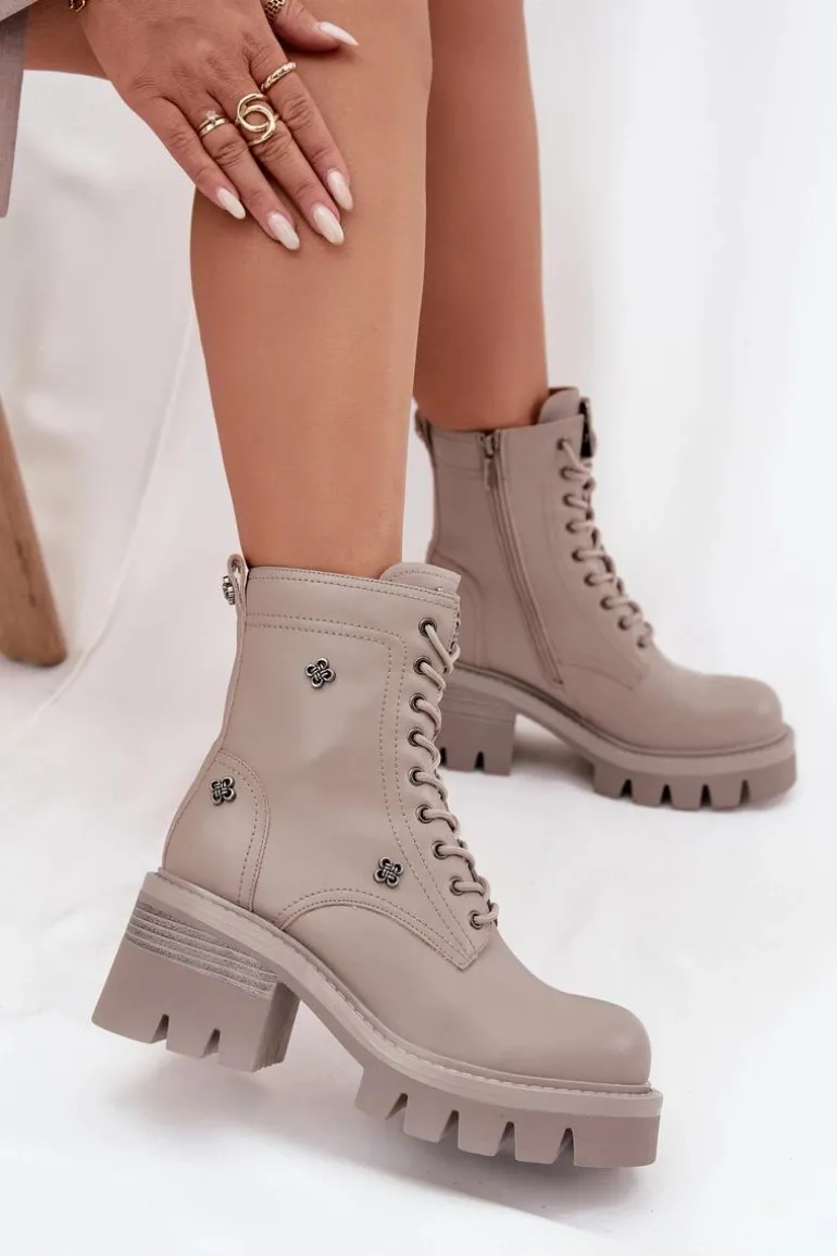 Botki damskie od marki Artiker. Wykonane z naturalnej skóry, prezentują się stylowo i są wyjątkowo trwałe. Model osadzony został na masywnym obcasie typu klocek oraz platformie, co zapewnia stabilność i wygodę podczas noszenia, jednocześnie dodając całości modnego charakteru. Buty są sznurowane i zapinane na zamek, dzięki czemu łatwo je dopasować do stopy i wygodnie zakładać. Na cholewce umieszczono ozdobne, drobne przypinki, które podkreślają unikalny styl modelu. Wnętrze zostało ocieplone, co sprawia, że botki świetnie sprawdzą się w chłodniejsze dni. To idealna propozycja dla kobiet, które cenią połączenie elegancji, komfortu i oryginalnego, miejskiego stylu. Przy wyborze rozmiaru prosimy sugerować się tabelą rozmiarów.