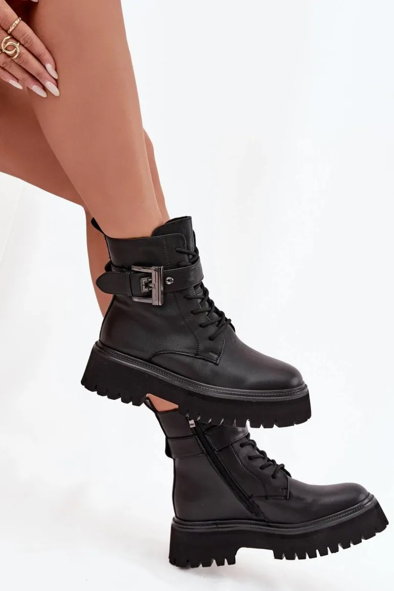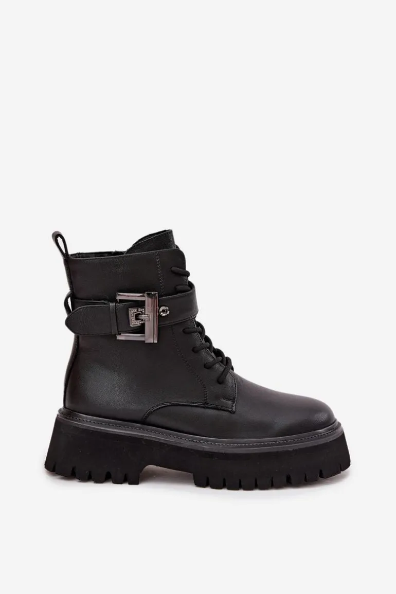 Botki workery damskie wykonane z naturalnej skóry. Model osadzony na platformie zapewnia stabilność oraz wygodę noszenia. Buty są sznurowane i zapinane na zamek, dzięki czemu doskonale dopasowują się do stopy i łatwo je zakładać. Wnętrze zostało ocieplone, co gwarantuje komfort i ciepło w chłodniejsze dni. Ozdobny pasek z klamrą nadaje im charakteru i modnego, lekko rockowego stylu. To doskonały wybór do codziennych stylizacji. Przy wyborze rozmiaru prosimy sugerować się tabelą rozmiarów.