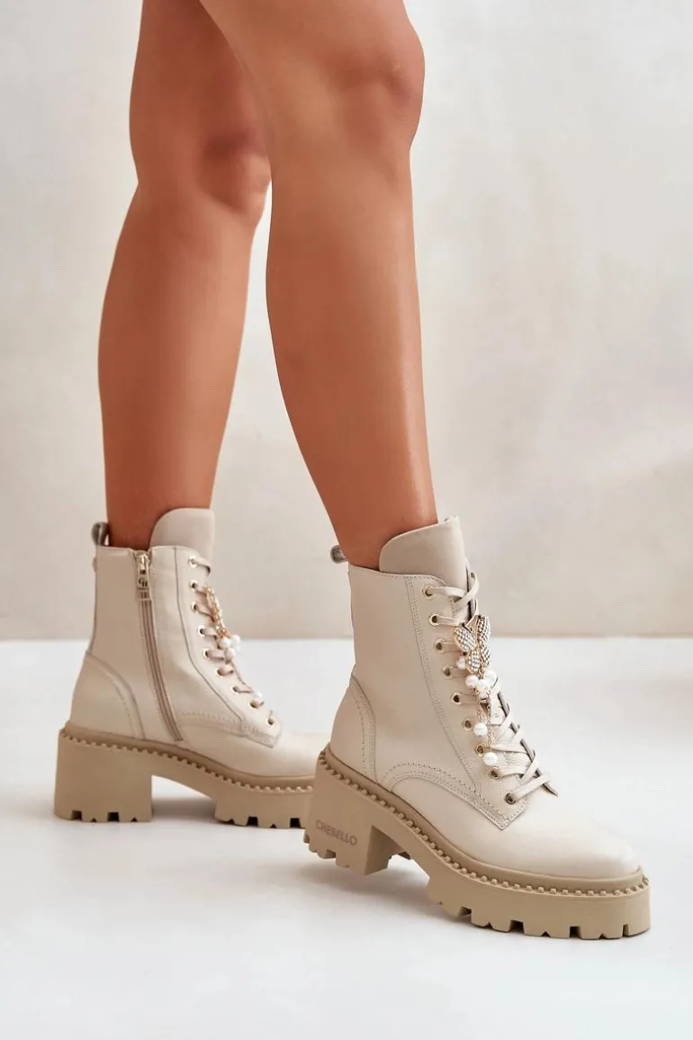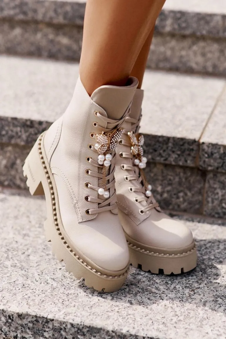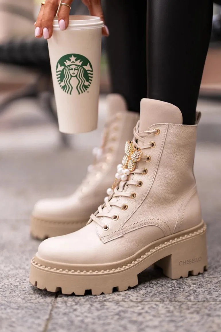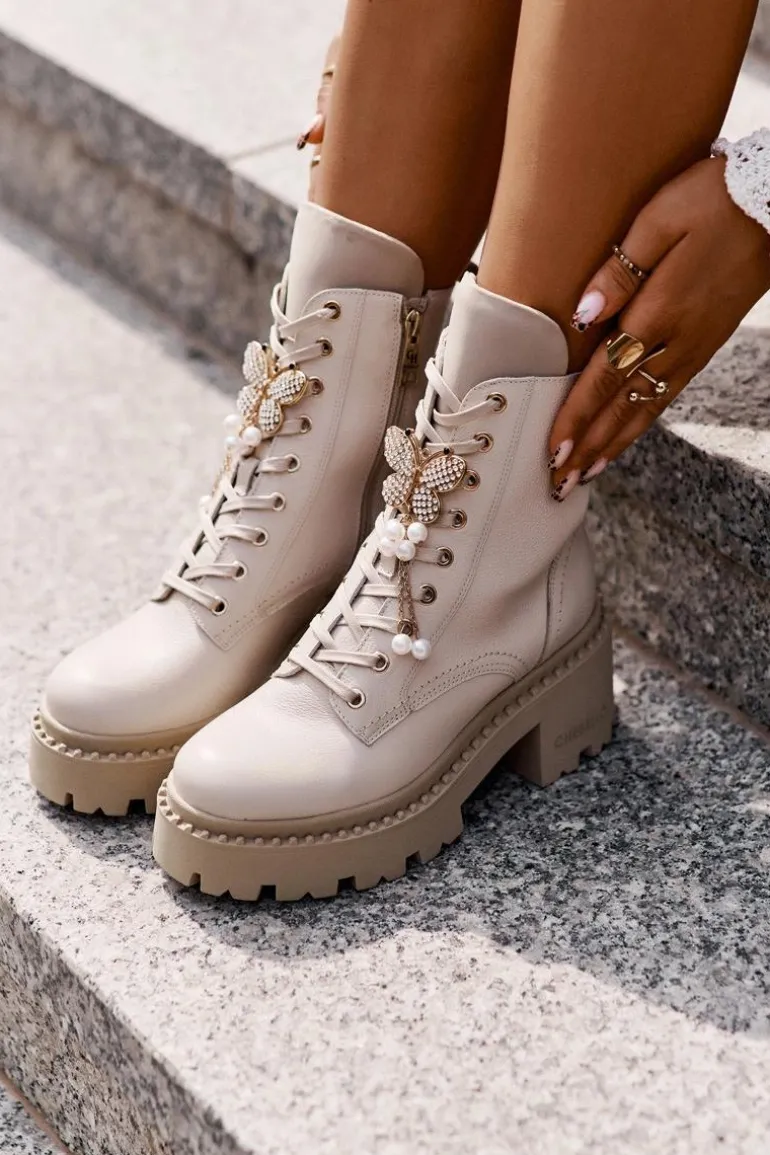 Botki marki CheBello wykonane z wysokiej jakości skóry naturalnej. Wnętrze lekko ocieplone, co zapewnia komfort noszenia w chłodniejsze dni. Model ten wyróżnia się uroczą przypinką w postaci motyla z koralikami. Noski zaokrąglone. Koniecznie powinnaś je mieć w swojej jesienno-zimowej szafie! Przy wyborze rozmiaru prosimy sugerować się tabelą rozmiarów.