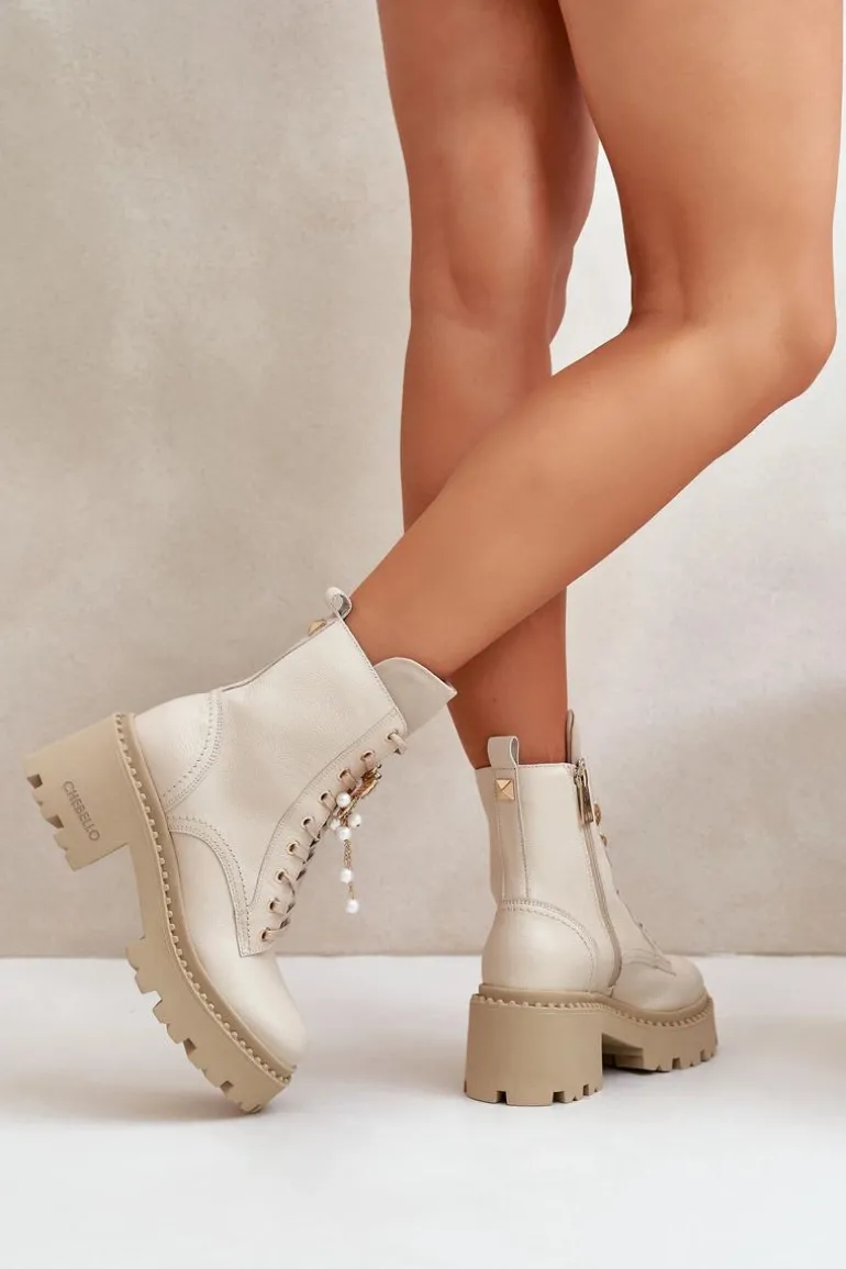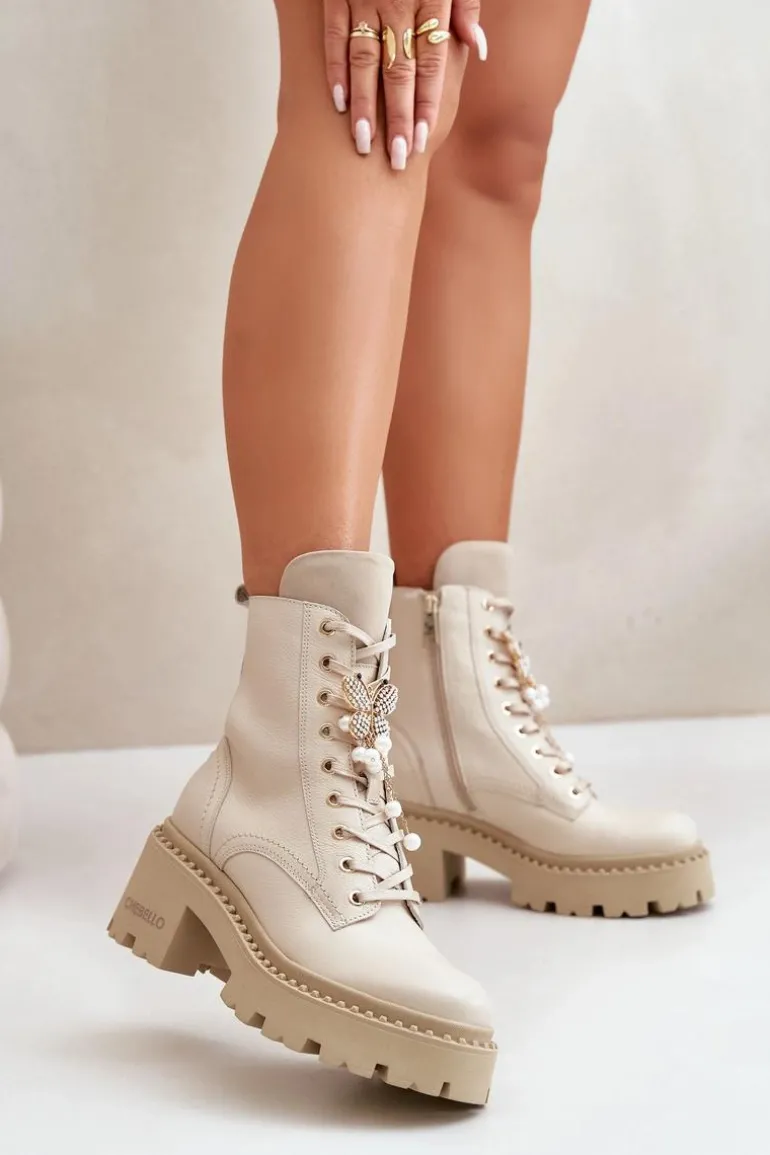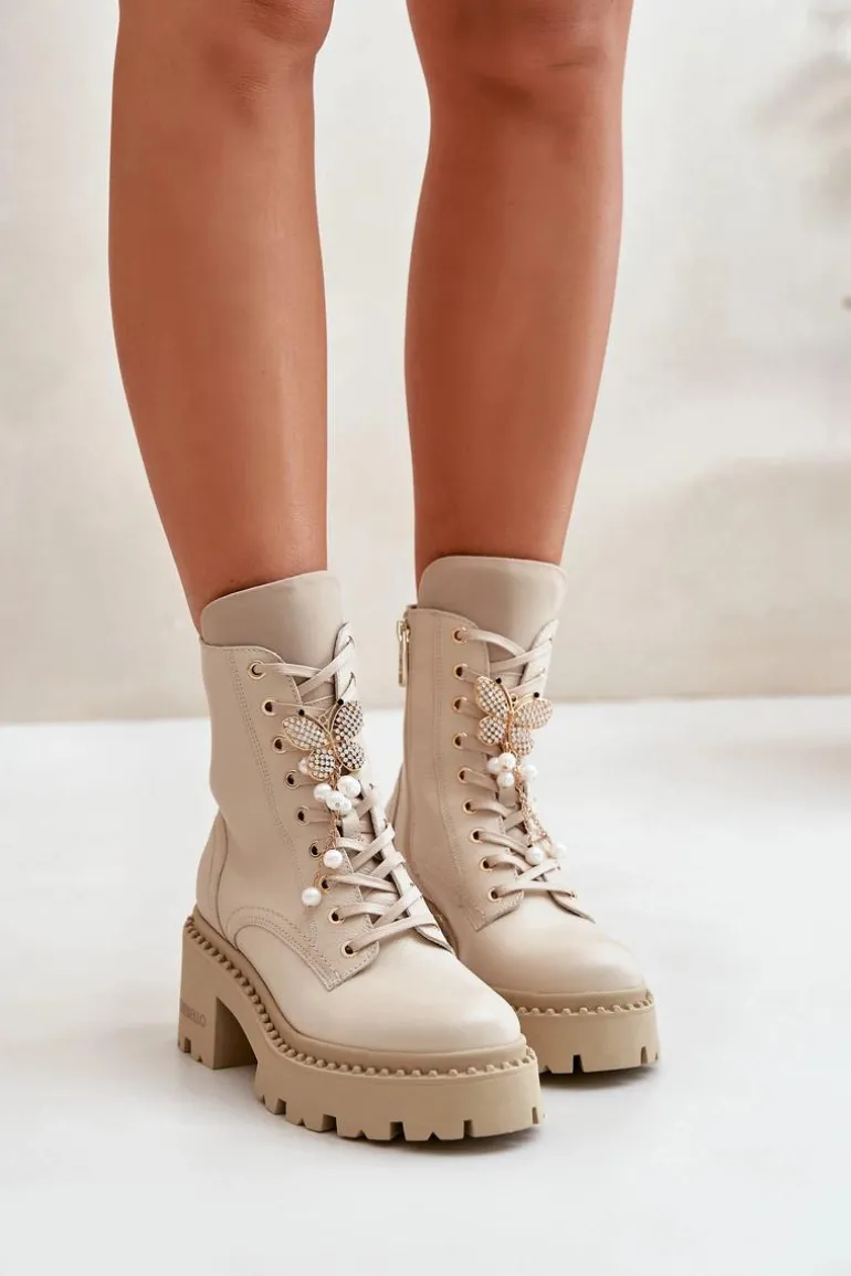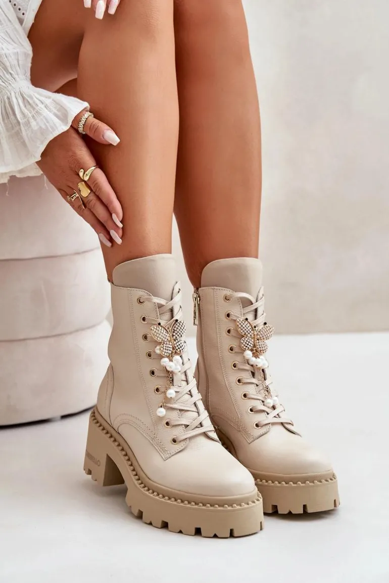 Botki marki CheBello wykonane z wysokiej jakości skóry naturalnej. Wnętrze lekko ocieplone, co zapewnia komfort noszenia w chłodniejsze dni. Model ten wyróżnia się uroczą przypinką w postaci motyla z koralikami. Noski zaokrąglone. Koniecznie powinnaś je mieć w swojej jesienno-zimowej szafie! Przy wyborze rozmiaru prosimy sugerować się tabelą rozmiarów.