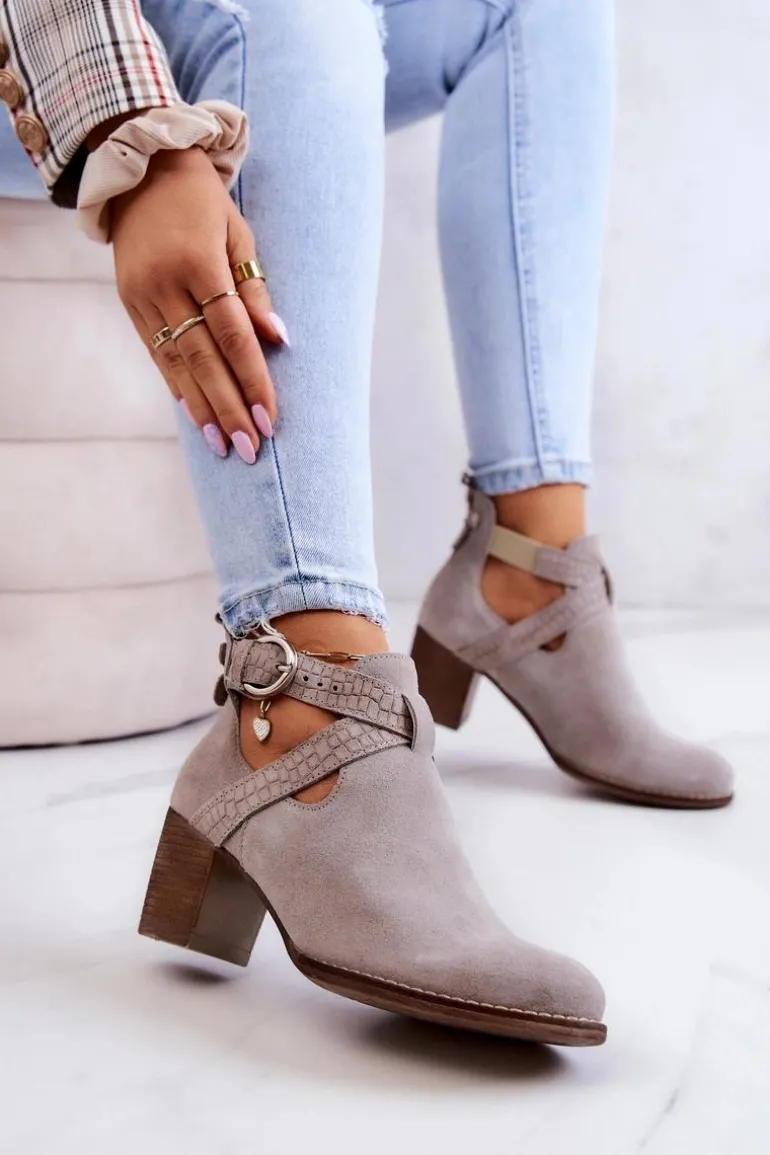 Botki wykonane z naturalnej zamszowej skóry z wycięciami po bokach cholewki. Wkładka wykonana z naturalnej skóry, co sprawia, że są bardzo komfortowe podczas użytkowania. Z boku cholewki znajduje się także regulowany pasek zapinany na sprzączkę oraz gumka. Obcas w postaci słupka. Tłoczona faktura oraz modny fason sprawiają, że te buty wyglądają naprawdę wyjątkowo. Nosek zamknięty, zaokrąglony. Koniecznie sprawdź także pozostałe modele skórzanych butów dostępnych w naszej ofercie! Przy wyborze rozmiaru prosimy sugerować się tabelą rozmiarów.