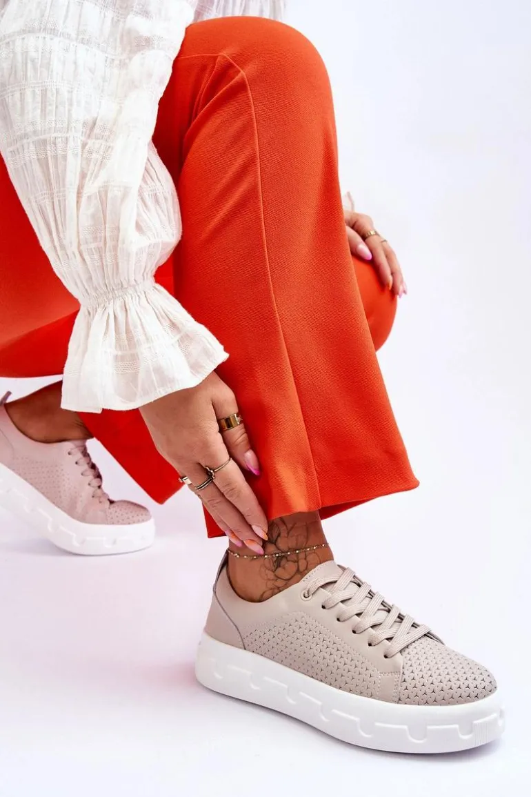 Te buty powinny być Twoje! Wykonane z wysokiej jakości naturalnej skóry z ciekawym wzorem. Osadzone na masywnej platformie wykonanej z tworzywa sztucznego. Model ten posiada klasyczne sznurowanie. Wkładka Comfort zapewni wygodę nawet przez cały dzień. Świetny model do dresów, jeansów czy dłuższych, prążkowanych sukienek.Przy wyborze rozmiaru prosimy sugerować się tabelą rozmiarów.