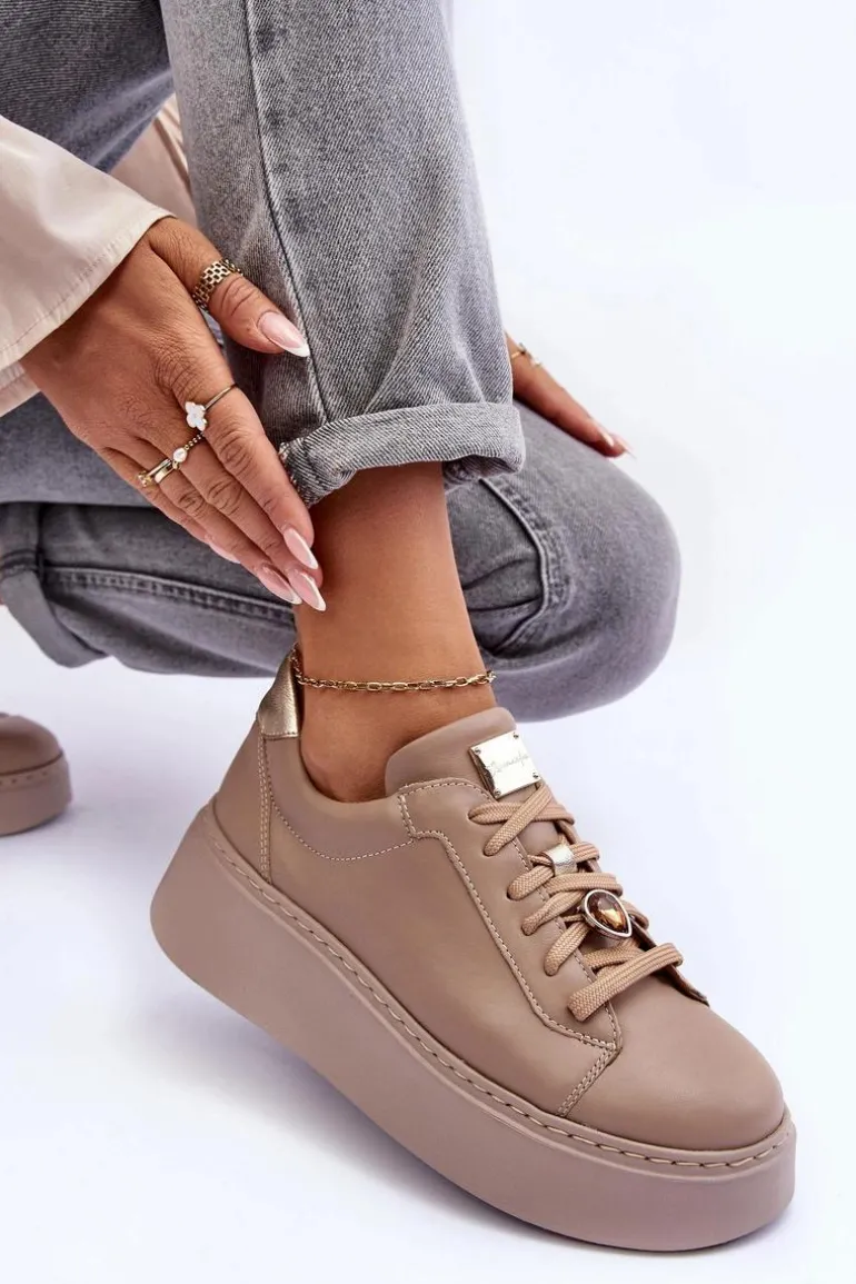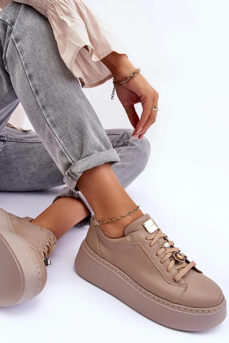Buty sportowe marki Maciejka. Wykonane z naturalnej skóry z dbałością o szczegóły. Osadzone na masywnej platformie. Model klasycznie sznurowany z usztywnionym zapiętkiem. Noski zaokrąglone. Miękka, wkładka zapewni komfort podczas użytkowania. Na sznurówkach przypięta jest mała, biżuteryjna ozdoba. Przy wyborze rozmiaru prosimy sugerować się tabelą rozmiarów.